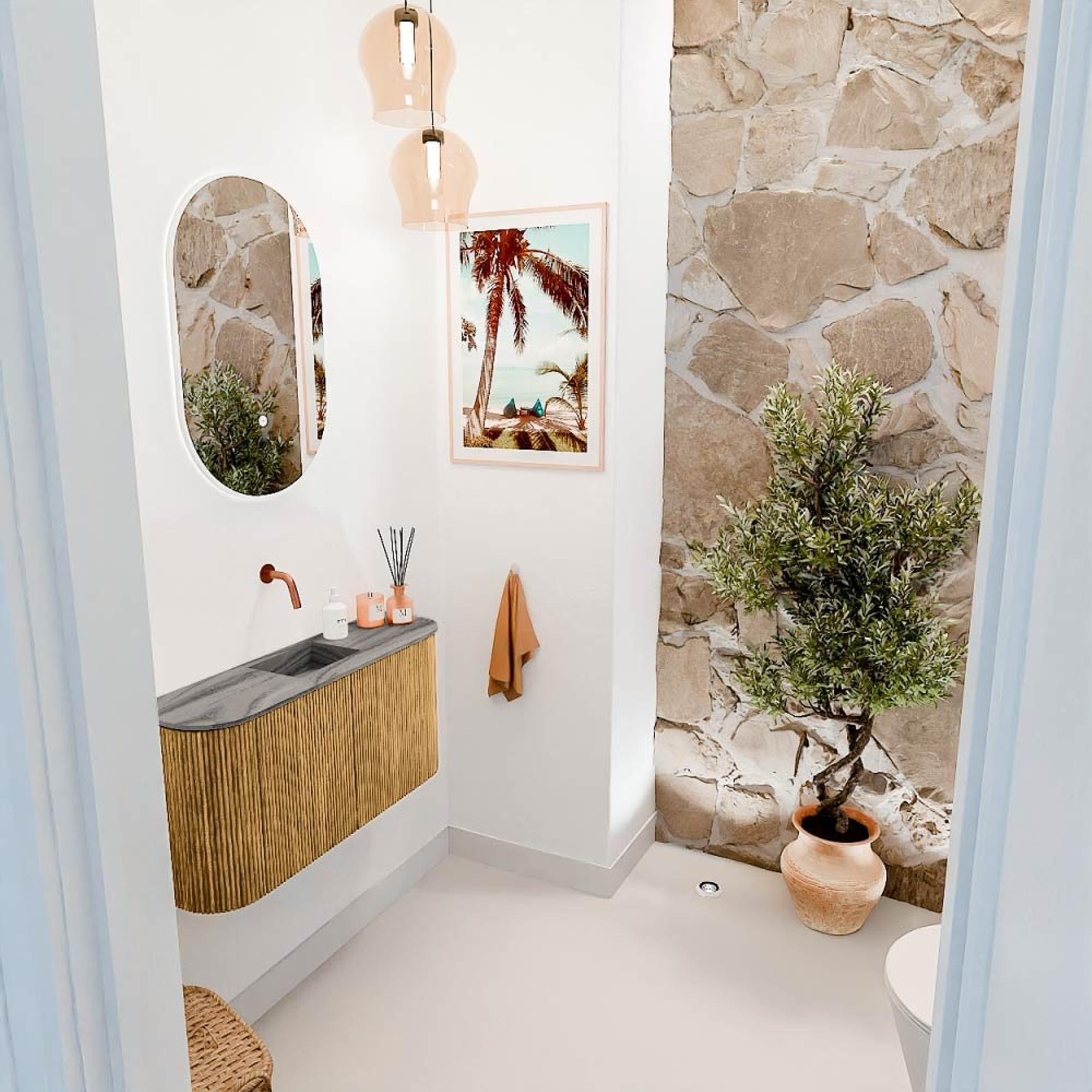 De verticale ribbelstructuur in het eikenhout geeft het meubel een moderne en verfijnde uitstraling. Dit detail zorgt voor een speels licht- en schaduweffect, waardoor het meubel een echte eyecatcher wordt in jouw badkamer. De warme, natuurlijke kleur van het eikenhout brengt sfeer en rust, terwijl de subtiele rondingen het geheel een zachte en elegante touch geven. Dit meubel past moeiteloos in zowel klassieke als eigentijdse interieurs en tilt jouw badkamer naar een hoger niveau van design en comfort.
