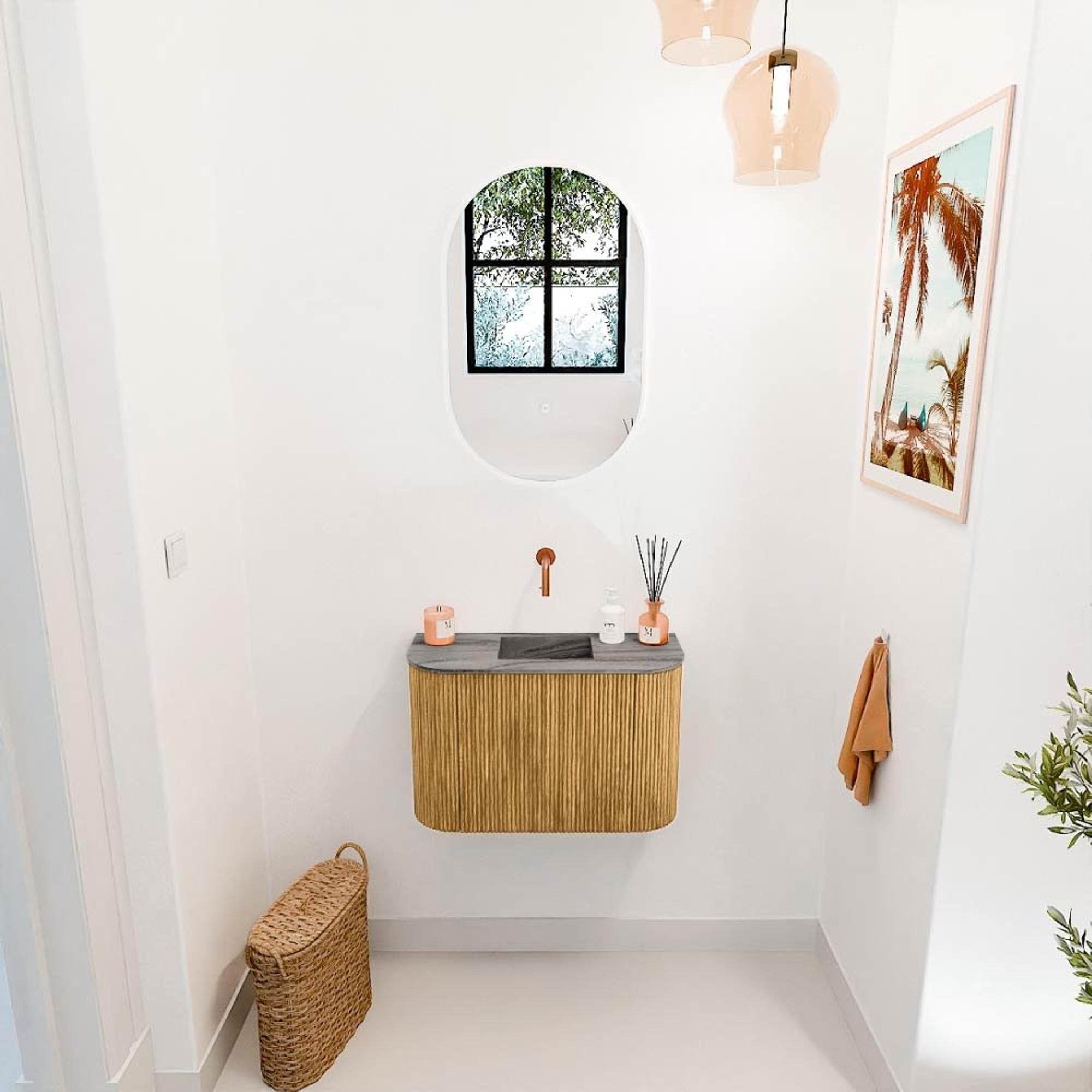 De warme eikenhoutkleur en de elegante rondingen maken dit meubel tot een echte blikvanger. Het natuurlijke hout zorgt voor een sfeervolle en rustgevende ambiance, terwijl de strakke afwerking het geheel een moderne touch geeft. Door de combinatie van verschillende houtstructuren ontstaat een speels, maar toch harmonieus geheel dat moeiteloos aansluit bij diverse badkamerstijlen. Zo geniet je van een meubel dat niet alleen functioneel is, maar ook jouw persoonlijke smaak perfect weerspiegelt.