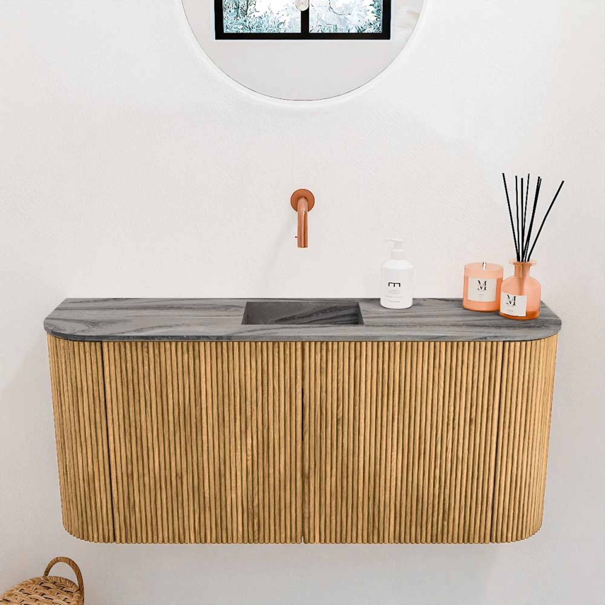 De combinatie van massief eikenhout en eikenfineer geeft dit meubel een exclusieve en natuurlijke uitstraling die direct opvalt. De verticale ribbels en de afgeronde zijden zorgen voor een uniek design dat zowel modern als tijdloos is. Hierdoor past het meubel moeiteloos in verschillende badkamerstijlen, van landelijk tot strak en minimalistisch. Door te kiezen voor dit meubel voeg je een stijlvol element toe dat jouw badkamer een warme en uitnodigende sfeer geeft.
