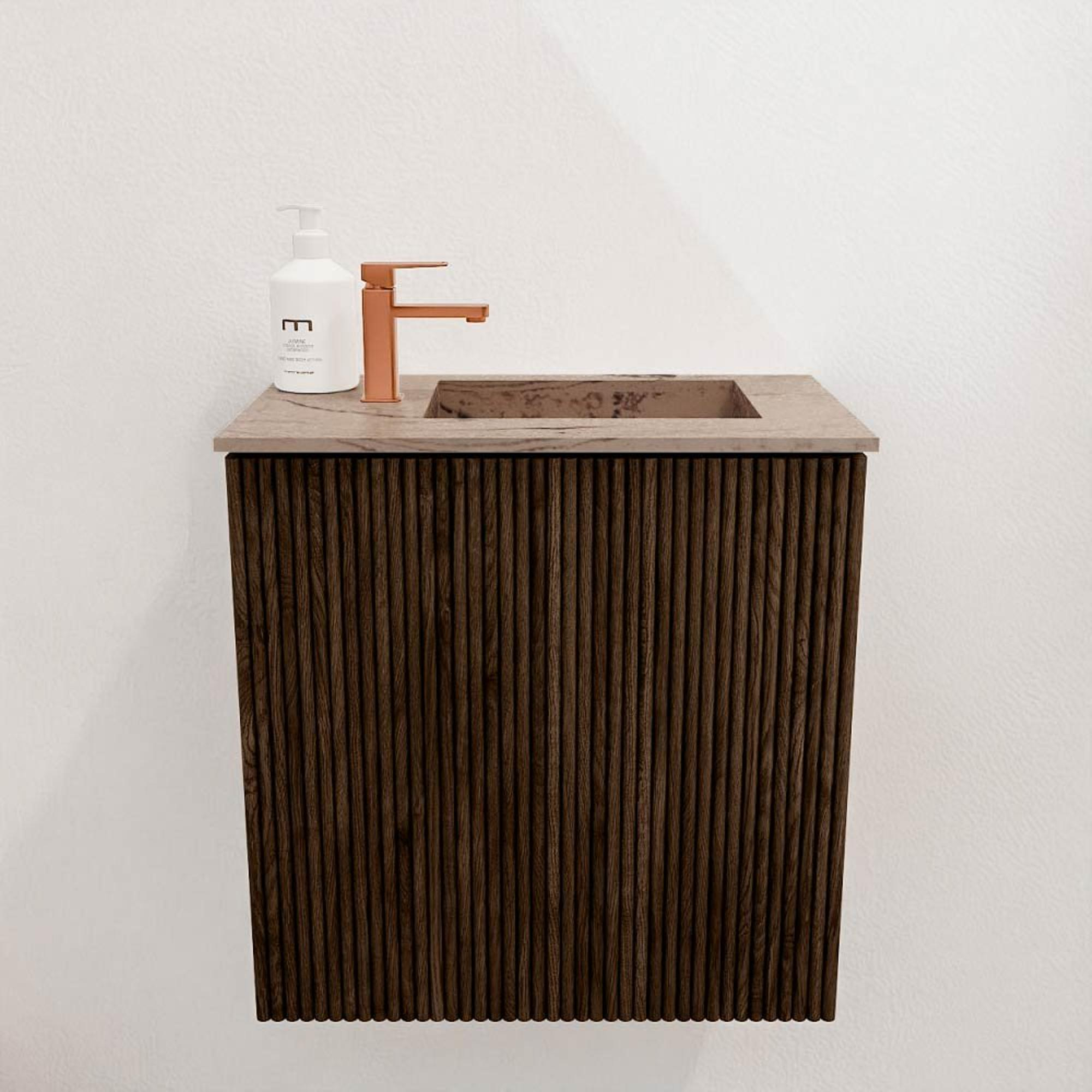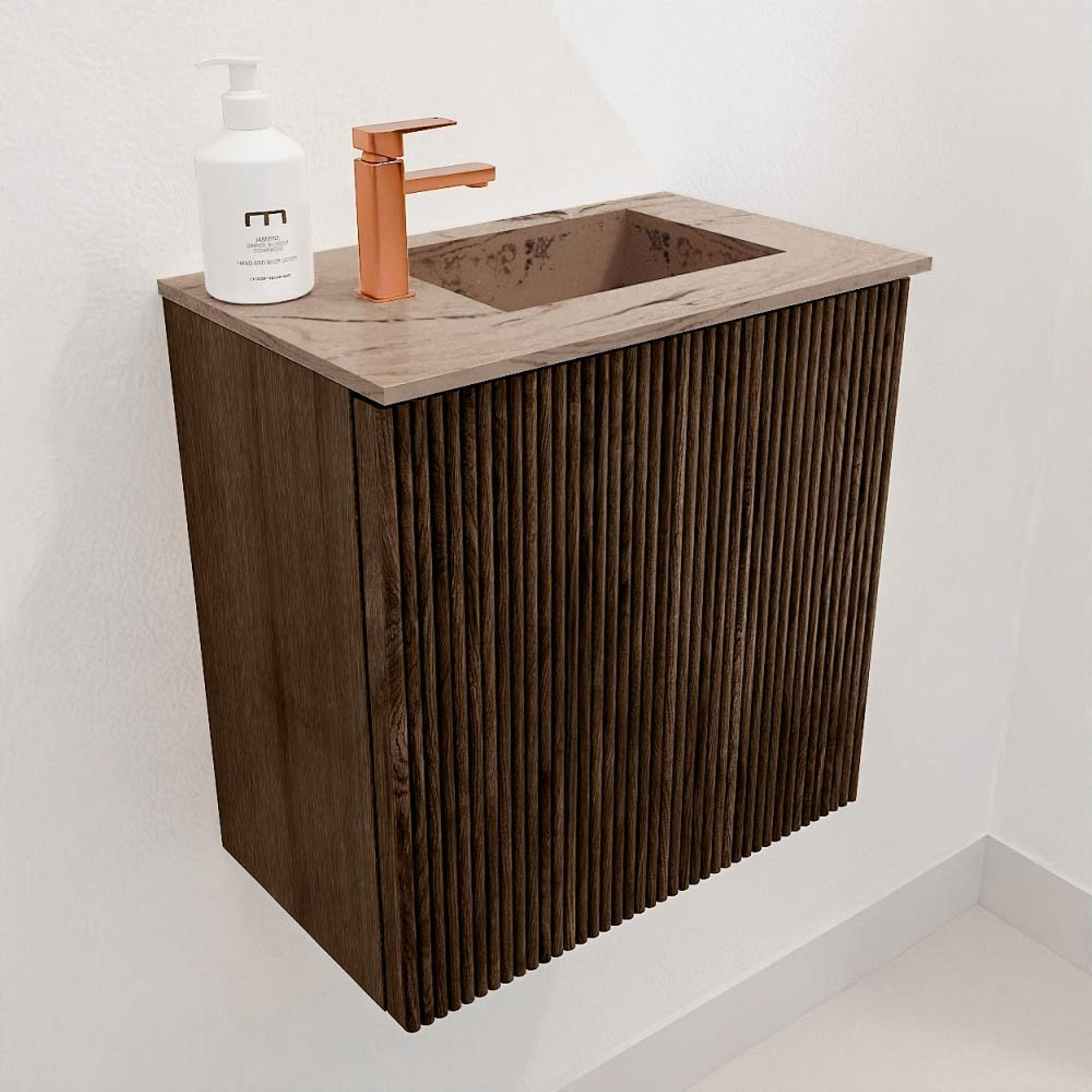 Met dit compacte meubel geef je jouw badkamer of gastentoilet direct een stijlvolle upgrade. Het combineert een warme walnootkleur met een verfijnde afwerking van massief eikenhout en fineer, wat zorgt voor een natuurlijke en luxe uitstraling. Dankzij het doordachte ontwerp met verticale ribbelstructuur krijgt de ruimte een tijdloze en elegante sfeer. De wastafel, geplaatst aan de rechterkant, is uitgevoerd in de zachte Arena-kleur en heeft één kraangat, wat het gebruiksgemak verhoogt zonder in te leveren op design. Dit meubel is perfect voor kleinere ruimtes waar je toch niet wilt inleveren op kwaliteit en uitstraling. Door de wandmontage oogt het meubel ruimtelijk en makkelijk schoon te houden. Zo geniet je elke dag van een badkamer die niet alleen praktisch is, maar ook een warme en uitnodigende ambiance uitstraalt.