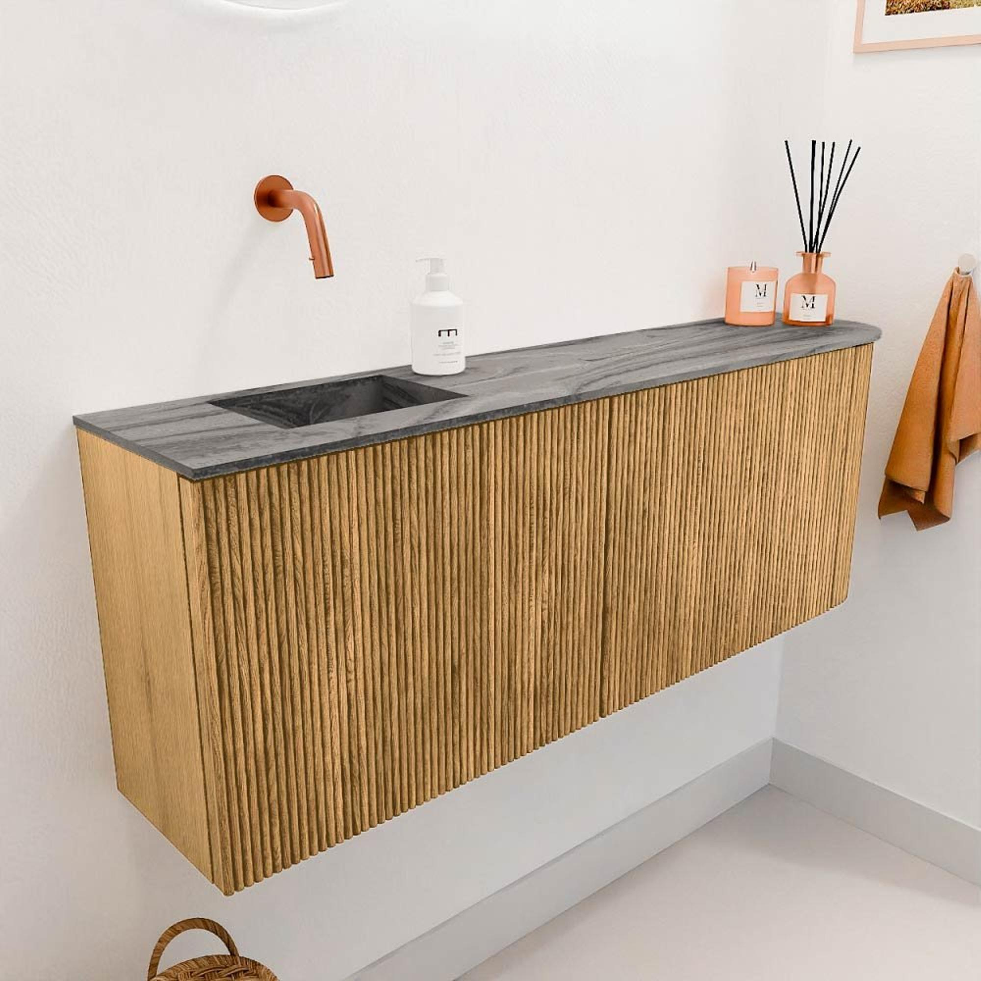 De combinatie van de warme eikenkleur en de zachte Sombra-wastafel maakt dit meubel tot een echte blikvanger. De ronde vorm aan de rechterzijde zorgt voor een uniek design dat subtiel afwijkt van standaard badkamermeubels. Hierdoor geef je jouw badkamer een persoonlijke touch die zowel modern als tijdloos oogt. Het meubel past moeiteloos in verschillende interieurstijlen, van landelijk tot industrieel. Zo geniet je van een stijlvolle badkamer die altijd in balans is en waar je trots op kunt zijn.
