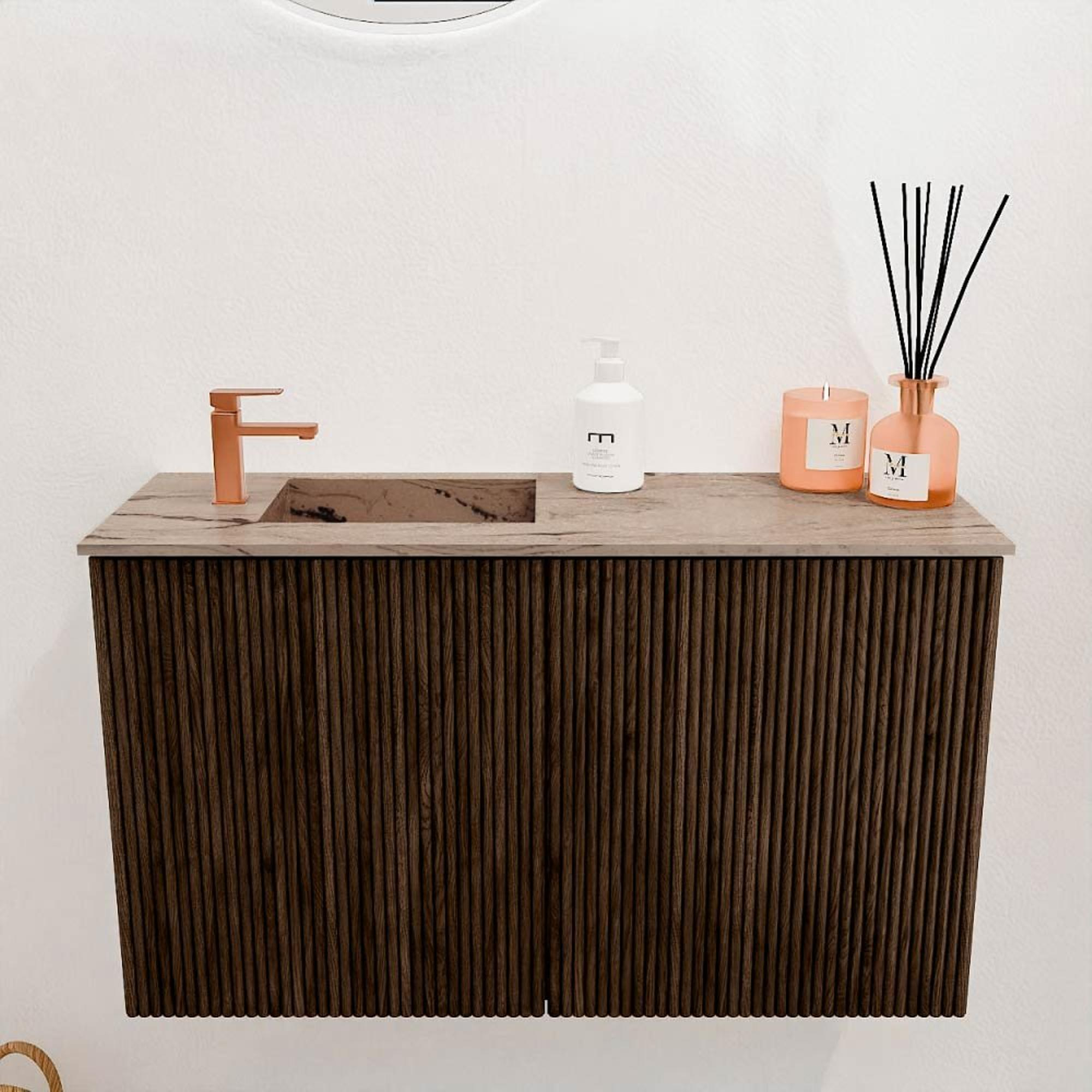 Mondiaz JOYA-DLUX 70cm toiletmeubel - kleur Walnut - Wastafel FAYE positie Links 1 kraangat kleur Arena.