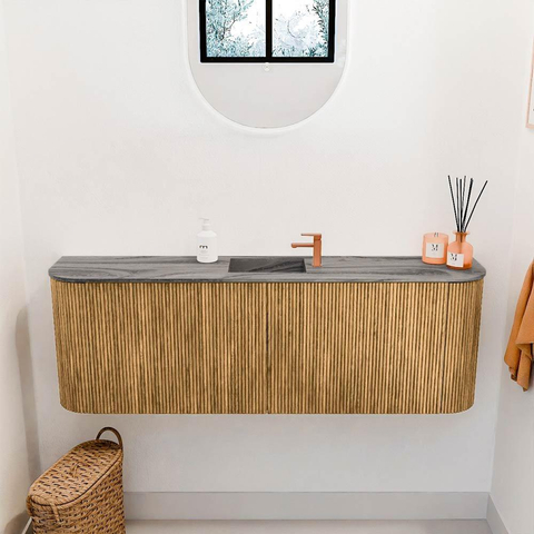 De combinatie van massief eikenhout en eiken fineer zorgt voor een natuurlijke en warme uitstraling die nooit uit de mode raakt. De afgeronde hoeken aan beide zijden geven het meubel een zachte, uitnodigende vorm die perfect past in moderne en klassieke badkamers. Door de subtiele kleur Oak krijgt jouw badkamer een tijdloze elegantie die rust en comfort uitstraalt. Dit meubel is een echte eyecatcher die jouw interieur naar een hoger niveau tilt zonder te overheersen.