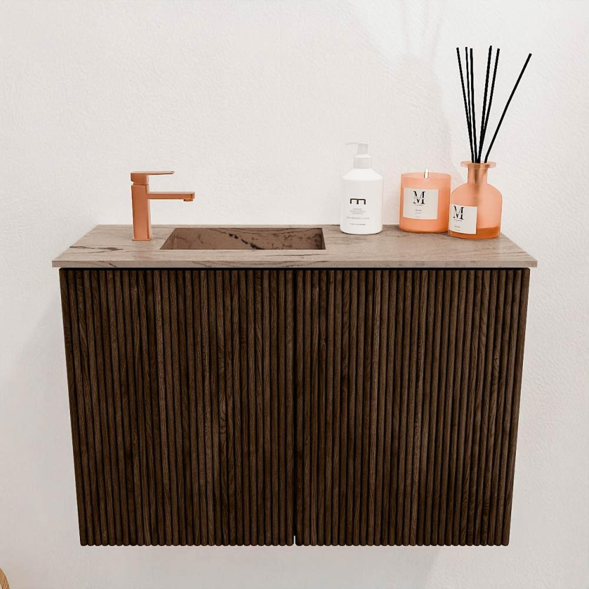 De warme walnootkleur en het gebruik van massief eikenhout geven het meubel een natuurlijke en luxe uitstraling. Dit zorgt ervoor dat het niet alleen een functioneel element is, maar ook een echte blikvanger in jouw badkamer. De combinatie van hout en de subtiele arena-kleurige wastafel creëert een harmonieus geheel dat rust en sfeer brengt. Door het tijdloze design past het meubel moeiteloos bij verschillende interieurstijlen, van modern tot klassiek. Zo investeer je in een badkamermeubel dat niet snel uit de mode raakt en jouw ruimte jarenlang verrijkt.