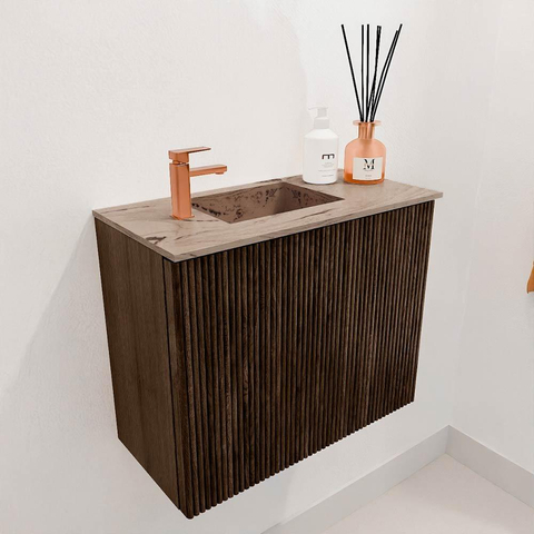 Mondiaz JOYA-DLUX 50cm toiletmeubel - kleur Walnut - Wastafel FAYE positie Links 1 kraangat kleur Arena.