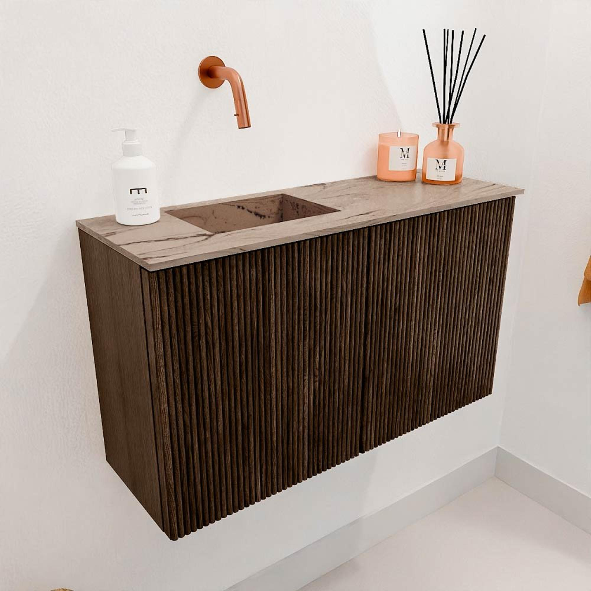 Mondiaz JOYA-DLUX 70cm toiletmeubel - kleur Walnut - Wastafel FAYE positie Links Zonder kraangat kleur Arena.