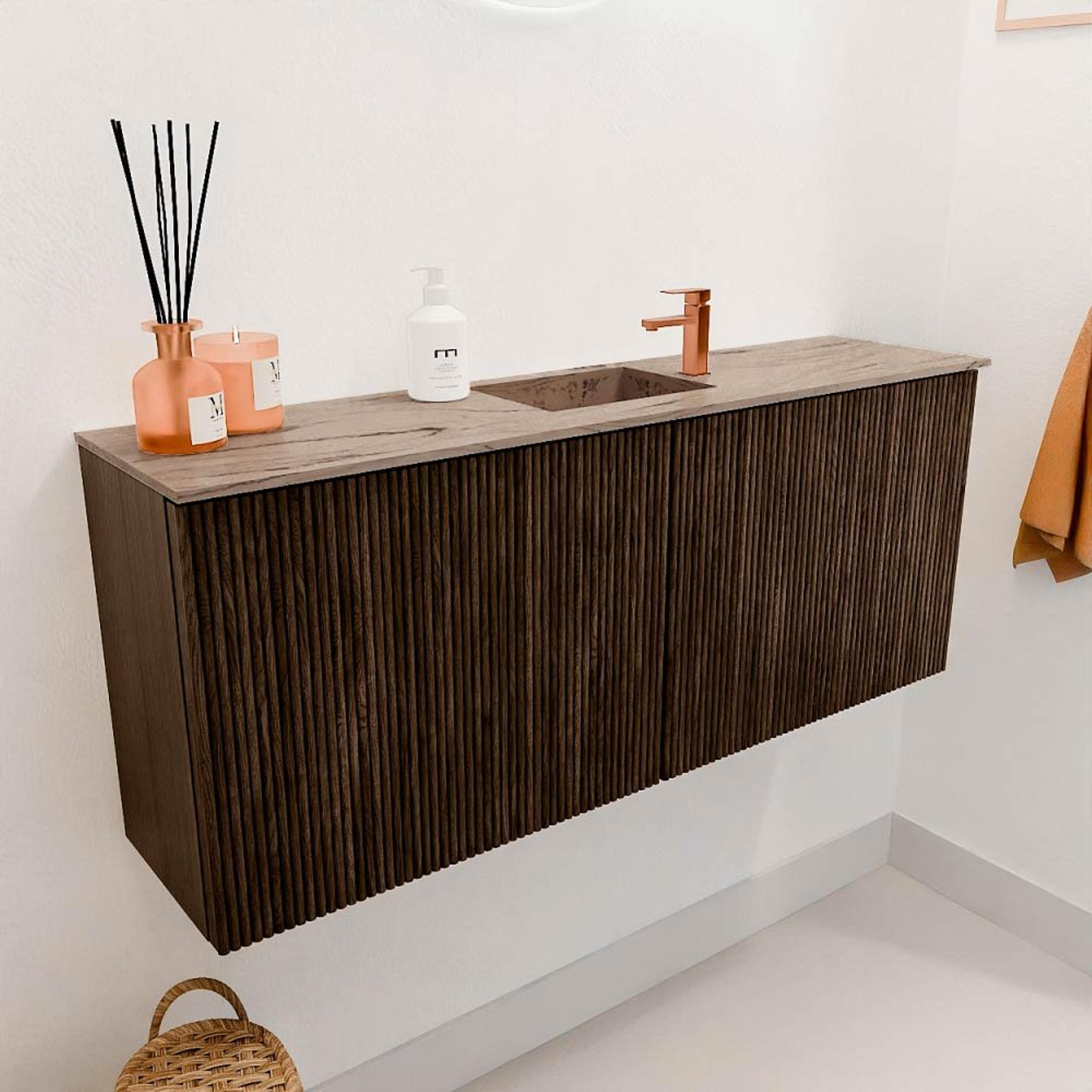 Het meubel valt meteen op door zijn elegante ontwerp met verticale ribbels op de fronten, die een subtiele maar luxe uitstraling geven. De warme walnootkleur en het gebruik van echt eikenhout maken het tot een blikvanger in iedere badkamer. Door de natuurlijke houtstructuur voelt het meubel niet alleen mooi aan, maar brengt het ook sfeer en karakter in je ruimte. Zo creëer je een badkamer die niet alleen functioneel is, maar ook uitnodigt tot ontspanning en genieten.