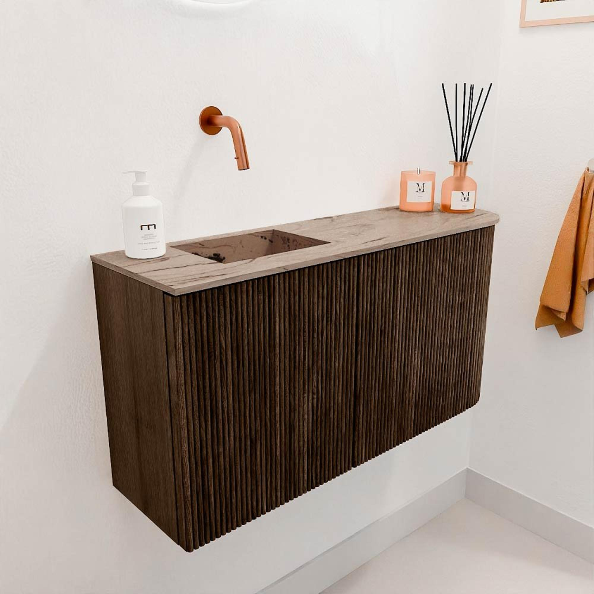Mondiaz JOYA-DLUX 81.6cm toiletmeubel - ronding rechts kleur Walnut - Wastafel FAYE positie Links Zonder kraangat kleur Arena.