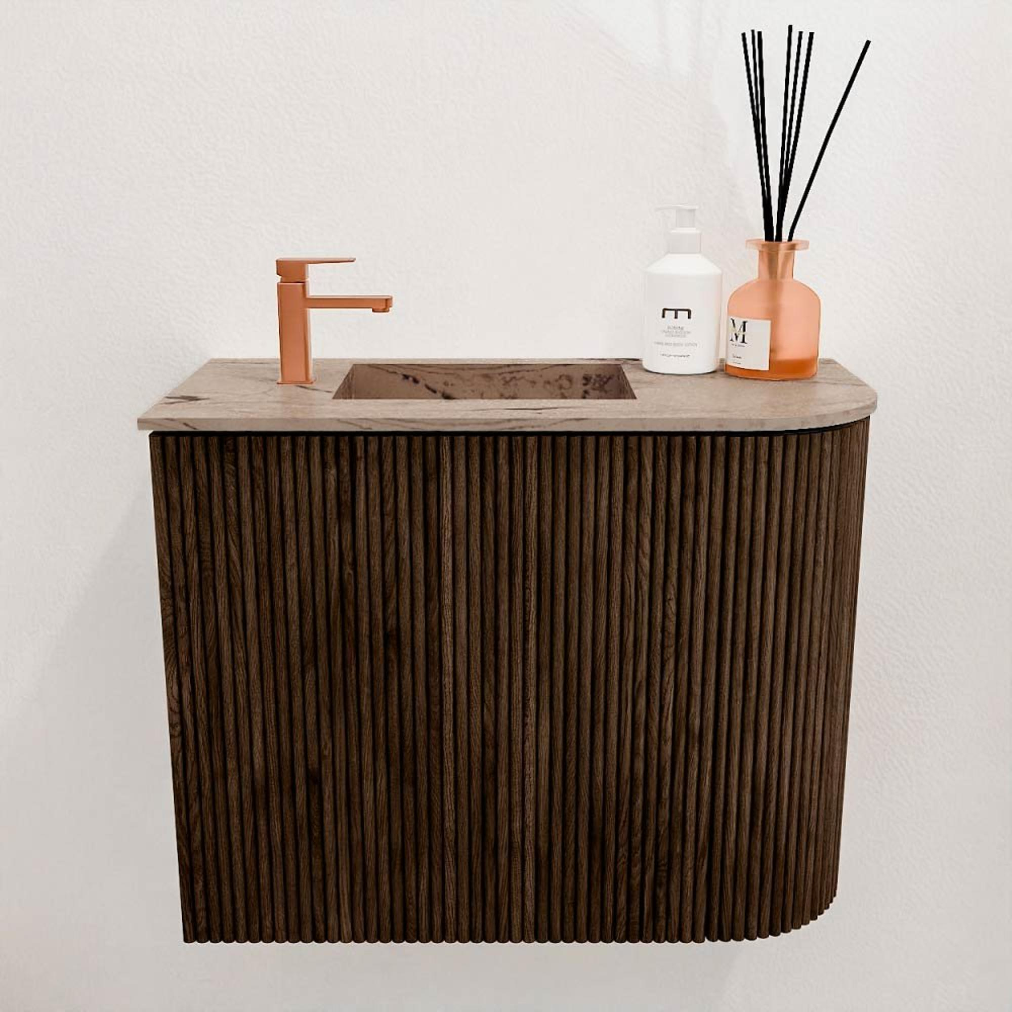 De combinatie van de warme walnootkleur en de zachte Arena wastafel zorgt voor een tijdloze en elegante uitstraling. De afgeronde rechterzijde geeft het meubel een uniek karakter en maakt het een echte blikvanger in je badkamer. De verticale groeven voegen een subtiel designaccent toe, waardoor het meubel modern oogt zonder te overheersen. Dit meubel past perfect in zowel klassieke als moderne badkamers en geeft je ruimte een warme, uitnodigende sfeer. Door het doordachte design geniet je van een badkamermeubel dat niet alleen functioneel is, maar ook een stijlvolle toevoeging aan je interieur.