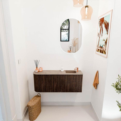 De warme walnootkleur en de subtiele ronding aan de linkerkant maken dit meubel tot een echte blikvanger. Het design is tijdloos en toch modern, waardoor het naadloos aansluit bij diverse interieurstijlen. De wastafel in Arena-kleur met rechts geplaatste kraangat voegt een verfijnde nuance toe die je badkamer een luxe uitstraling geeft. Zo geniet je niet alleen van een mooi meubel, maar ook van een badkamer die je trots maakt.
