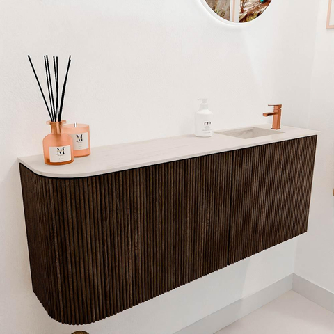 Dit meubel valt direct op door zijn elegante uitstraling. De combinatie van massief eikenhout en eikenfineer in een warme walnootkleur zorgt voor een natuurlijke en luxe sfeer. De subtiele ronding aan de linkerkant geeft het meubel een uniek karakter zonder afbreuk te doen aan de strakke, moderne lijnen. Hierdoor past het perfect in zowel klassieke als eigentijdse badkamers. Met dit meubel voeg je een tijdloos element toe dat jarenlang mooi blijft en je badkamer een warme, uitnodigende uitstraling geeft.