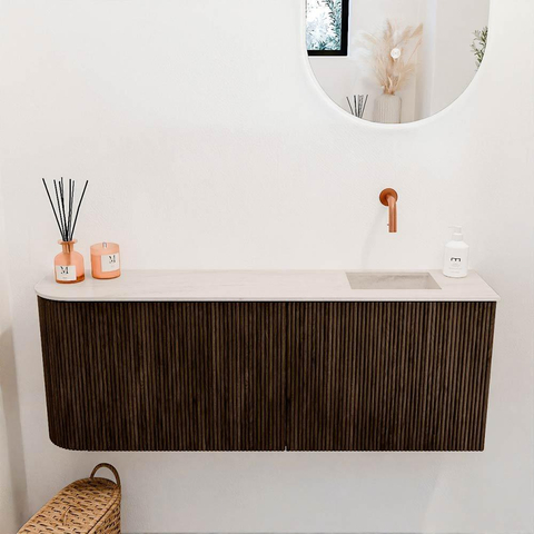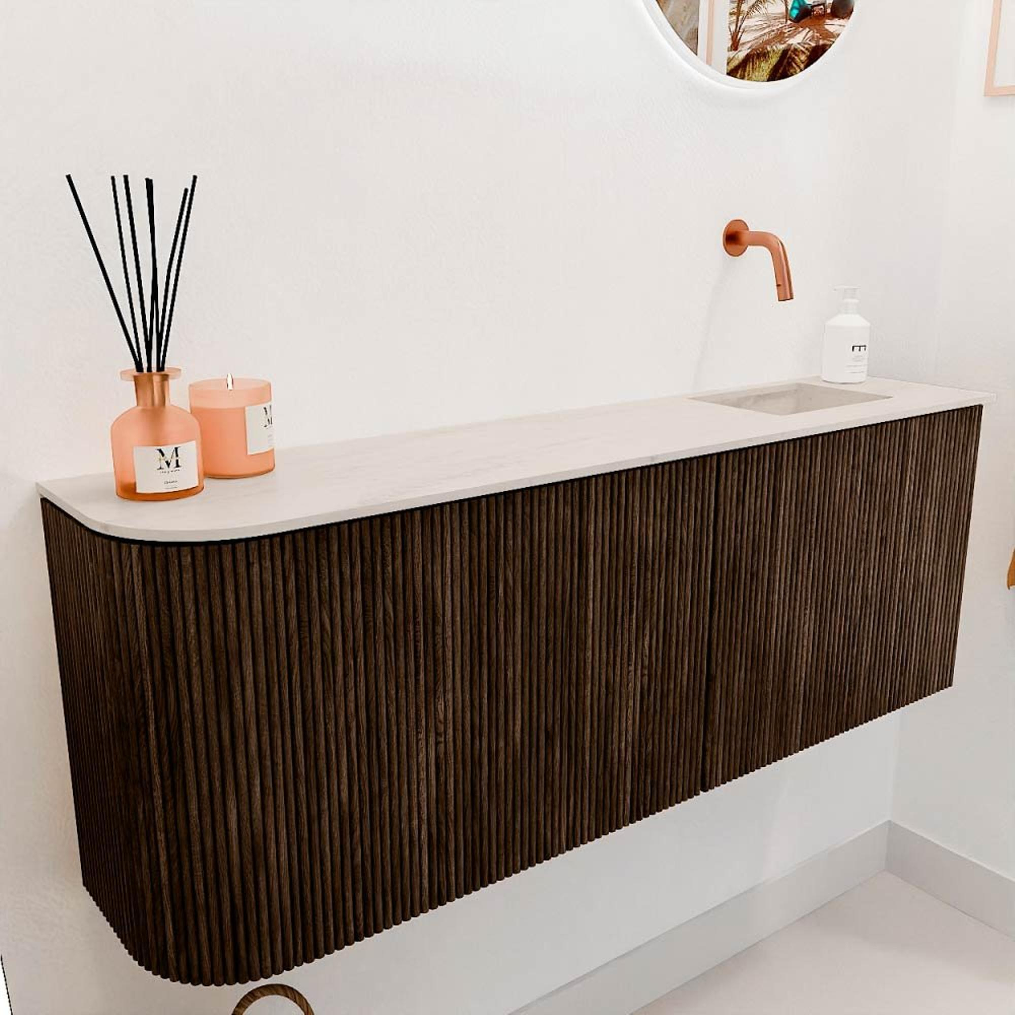 De warme walnootkleur en de elegante ronding aan de linkerkant geven dit meubel een unieke en verfijnde uitstraling. Het natuurlijke houtfineer op de fronten en zijkanten zorgt voor een authentieke sfeer, terwijl de moderne vormgeving het geheel eigentijds houdt. Dit meubel past perfect in zowel klassieke als moderne badkamers en voegt direct karakter toe. Door de subtiele details en het hoogwaardige afwerkingsniveau voelt het meubel luxe aan zonder te overheersen. Zo creëer je een badkamer die uitnodigt tot ontspanning en waar je met trots je gasten ontvangt.