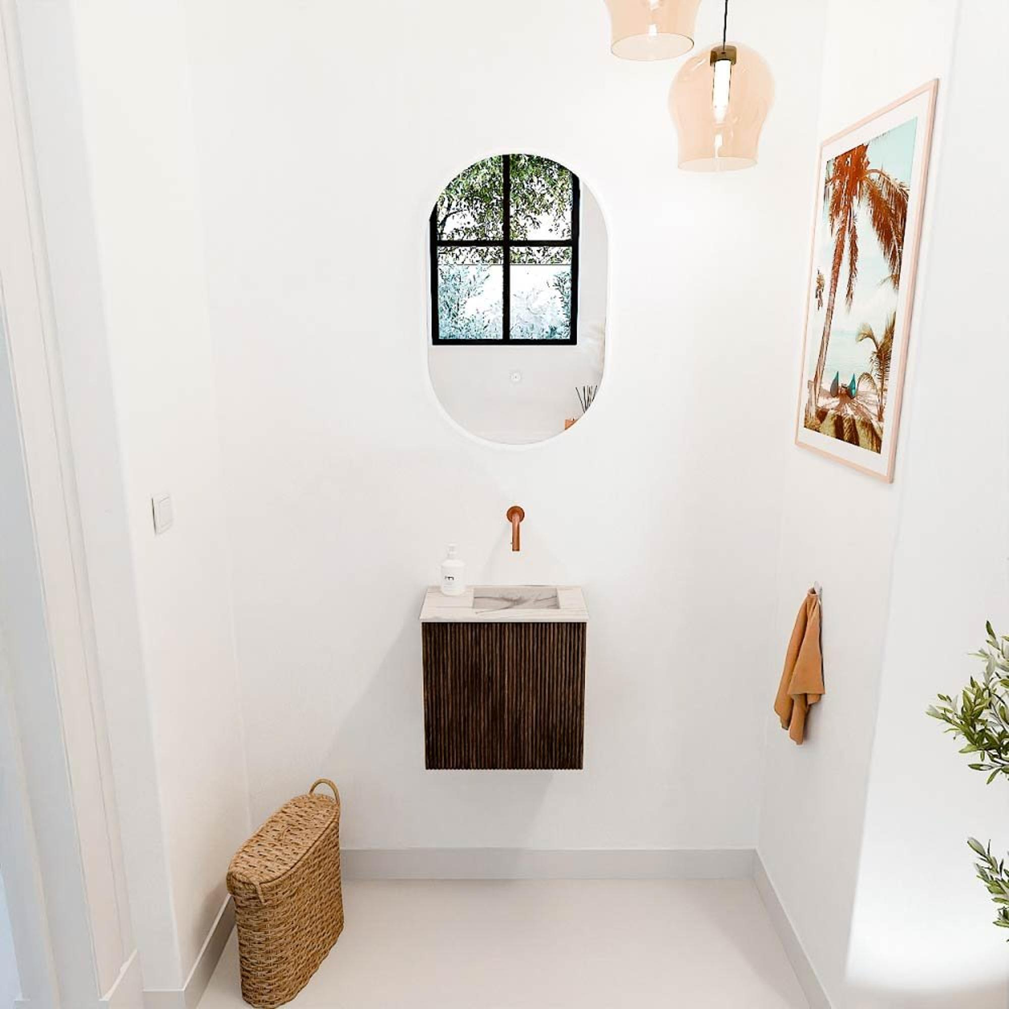 Met dit compacte en stijlvolle meubel geef je jouw toilet een warme en natuurlijke uitstraling. Dankzij de hoogwaardige afwerking in walnootkleur en het gebruik van massief eikenhout aan de voorkant, straalt het meubel direct kwaliteit en vakmanschap uit. De bijpassende wastafel, subtiel geplaatst aan de rechterkant zonder kraangat, zorgt voor een strakke en moderne look die perfect past in een eigentijdse badkamer. Dit meubel is ideaal voor kleinere ruimtes waar je toch niet wilt inleveren op stijl en functionaliteit. Door het slimme ontwerp en de praktische afmetingen creëer je een opgeruimde en uitnodigende sfeer, waar je elke dag met plezier begint. De combinatie van natuurlijke materialen en een doordachte vormgeving maakt dit meubel tot een waardevolle toevoeging die jouw badkamer een persoonlijke touch geeft.