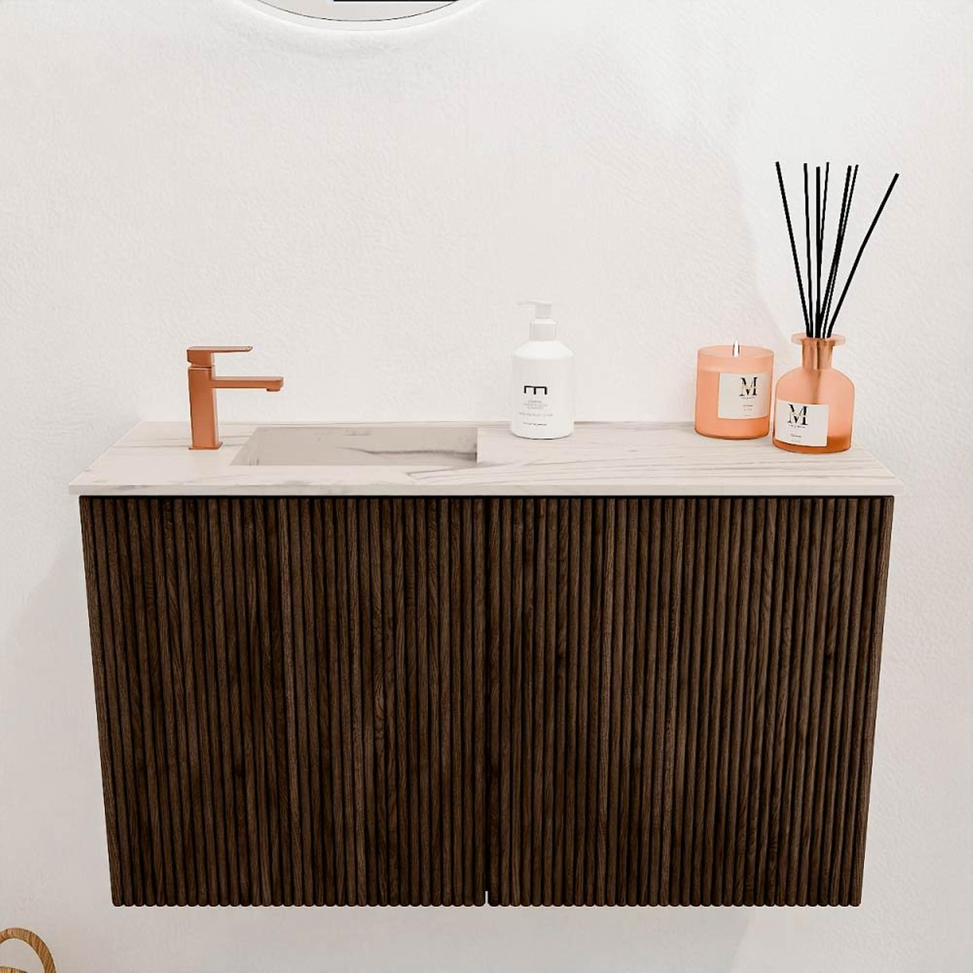 Met twee ruime deuren biedt dit meubel voldoende opbergruimte om jouw toiletartikelen netjes en uit het zicht te houden. De praktische indeling helpt je om alles georganiseerd te houden, waardoor je badkamer altijd opgeruimd oogt. De wastafel met links geplaatst kraangat maakt het aansluiten van de kraan eenvoudig en zorgt voor een prettige gebruikservaring. Bovendien is het meubel ontworpen voor wandmontage, wat zorgt voor een moderne uitstraling en extra ruimte op de vloer. Zo combineer je functionaliteit met een strak design.