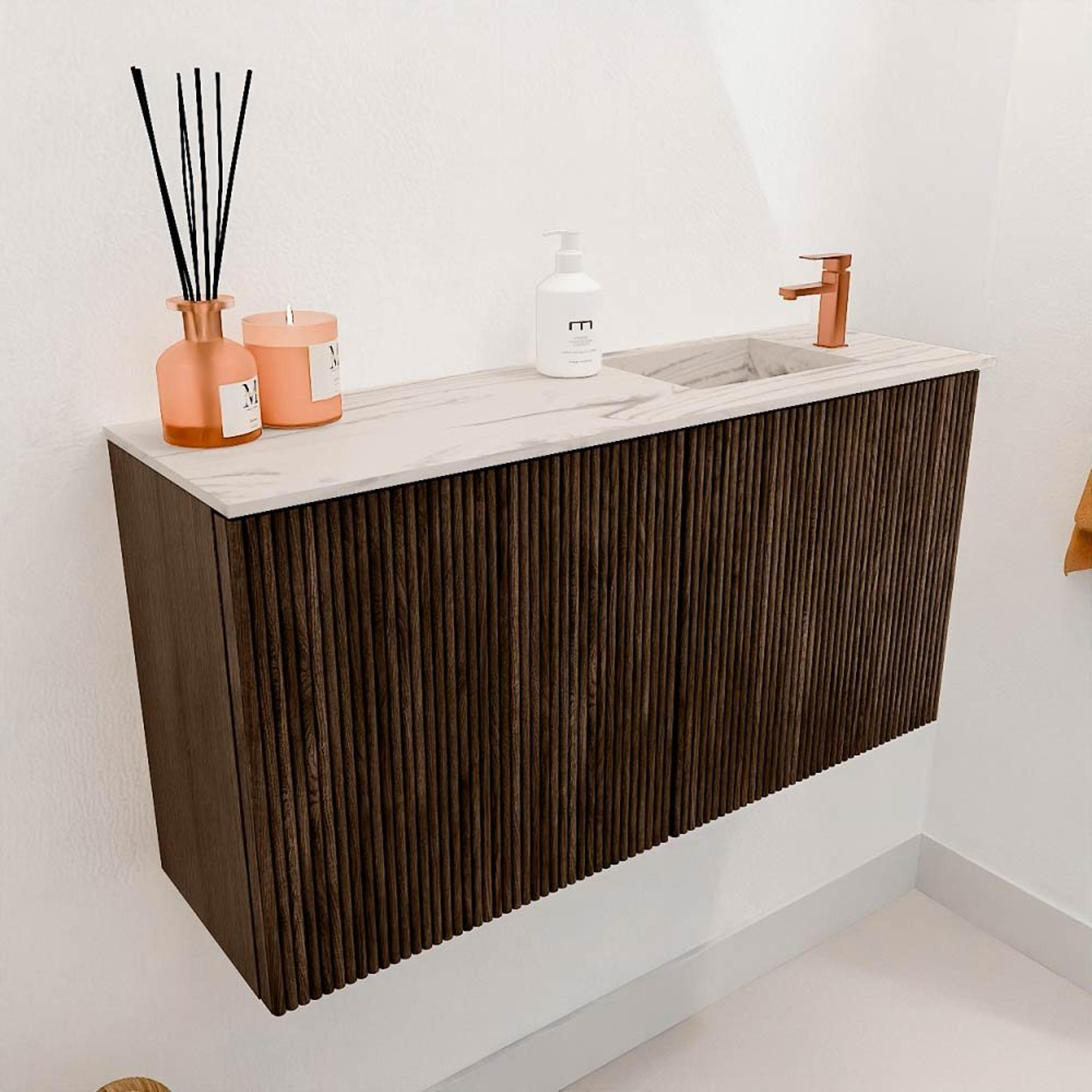 Het meubel valt direct op door zijn warme walnootkleur en de verticale groeven die het een exclusieve uitstraling geven. Deze subtiele details zorgen voor een tijdloos design dat moeiteloos aansluit bij verschillende interieurstijlen. Of je nu houdt van modern, klassiek of een natuurlijke uitstraling, dit meubel past er perfect bij. Het is niet alleen een functioneel element, maar ook een echte blikvanger die jouw badkamer een luxe gevoel geeft. Zo geniet je niet alleen van een mooie badkamer, maar ook van een ruimte die jouw persoonlijke stijl weerspiegelt.