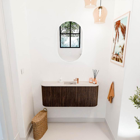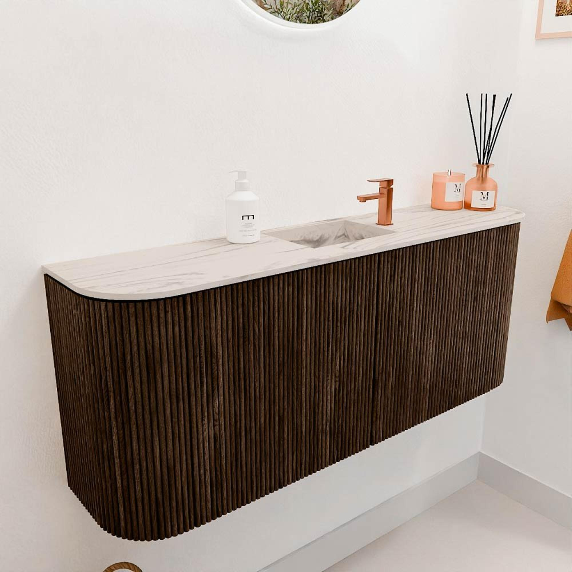 De uitstraling van dit meubel is bijzonder elegant en tijdloos. De warme walnootkleur met subtiele houtnerfdetails geeft je badkamer een natuurlijke en luxe sfeer. De ronde vormen aan de zijkanten zorgen voor een zachte en uitnodigende uitstraling, die de ruimte visueel verrijkt zonder te overheersen. Dit meubel past perfect in zowel moderne als klassieke badkamers en voegt een vleugje verfijning toe. Door het verticale ribbelpatroon op de fronten krijgt het meubel een speels en toch rustig karakter, wat zorgt voor een harmonieuze balans tussen design en functionaliteit.
