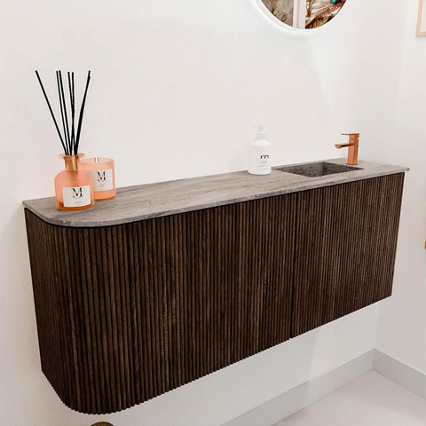 Het meubel valt direct op door zijn verfijnde design en warme walnootkleur. De combinatie van massief eikenhout en eikenfineer geeft het een natuurlijke uitstraling die moeiteloos aansluit bij diverse badkamerstijlen. Dankzij de subtiele ronding aan de linkerkant krijgt het meubel een uniek karakter, waardoor het niet alleen functioneel is, maar ook een echte eyecatcher in je badkamer. Deze stijlvolle afwerking zorgt ervoor dat je badkamer een warme en uitnodigende sfeer krijgt, waar je elke dag met plezier begint.