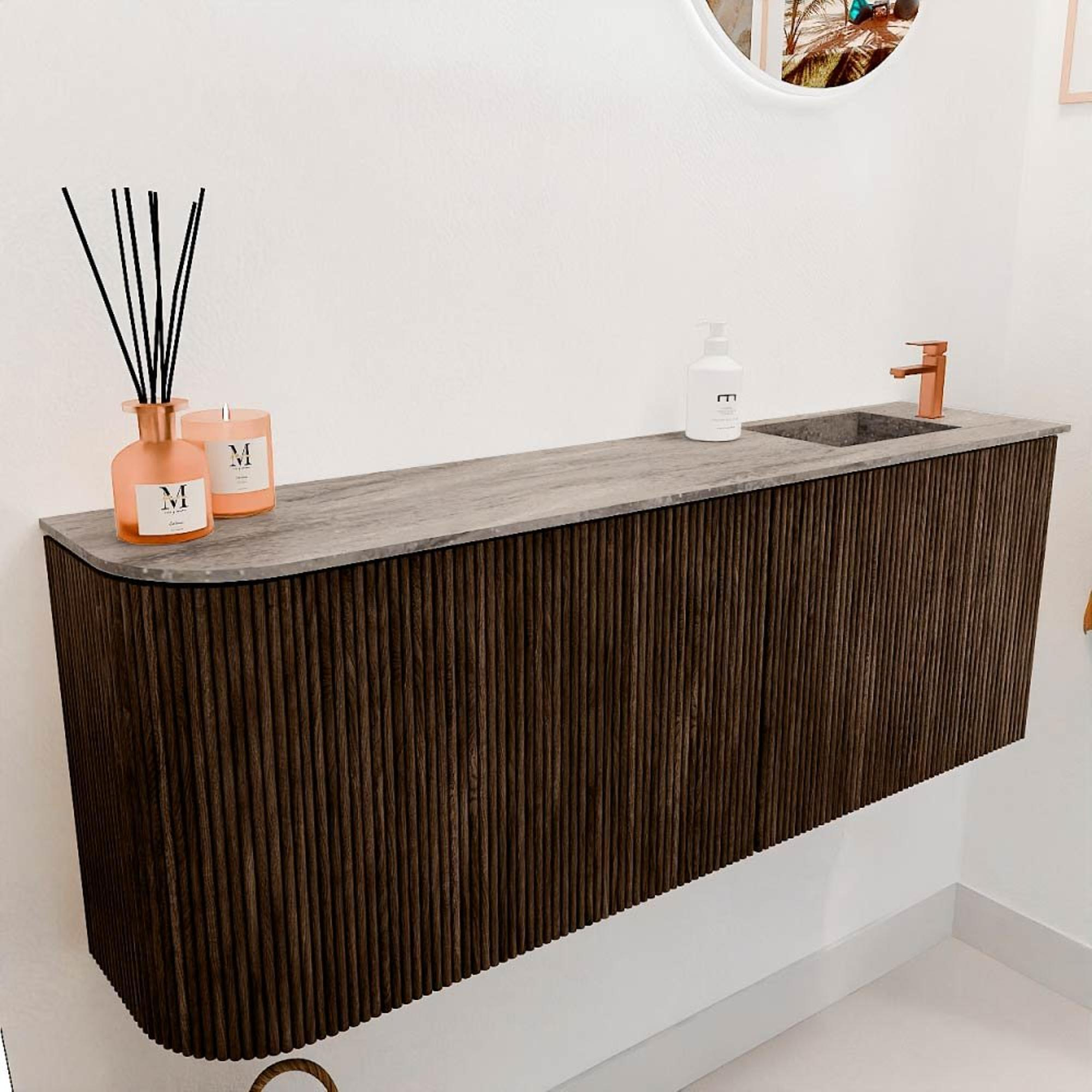 Dit meubel valt direct op door zijn tijdloze design en warme walnootkleur. De ronde vorm aan de linkerkant geeft het een uniek karakter dat jouw badkamer een persoonlijke touch geeft. Door de combinatie van massief eiken en multiplex met eikenfineer straalt het meubel luxe en vakmanschap uit. Het subtiele kleurcontrast tussen het meubel en de wastafel in Oza-kleur zorgt voor een harmonieus geheel. Zo voeg je moeiteloos een stijlvolle eyecatcher toe aan je interieur, die perfect aansluit bij diverse badkamerstijlen.