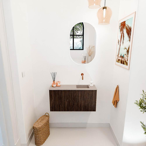 Dit meubel valt direct op door zijn verfijnde, verticale ribbelstructuur die een subtiele textuur en diepte aan het oppervlak geeft. De warme walnootkleur en de natuurlijke houtnerf zorgen voor een luxe uitstraling die moeiteloos past in zowel moderne als klassieke badkamers. Door het gebruik van massief eikenhout aan de voorkant straalt het meubel kwaliteit en vakmanschap uit. Zo voeg je niet alleen een functioneel element toe, maar ook een echte blikvanger die jouw badkamer een unieke en persoonlijke touch geeft.