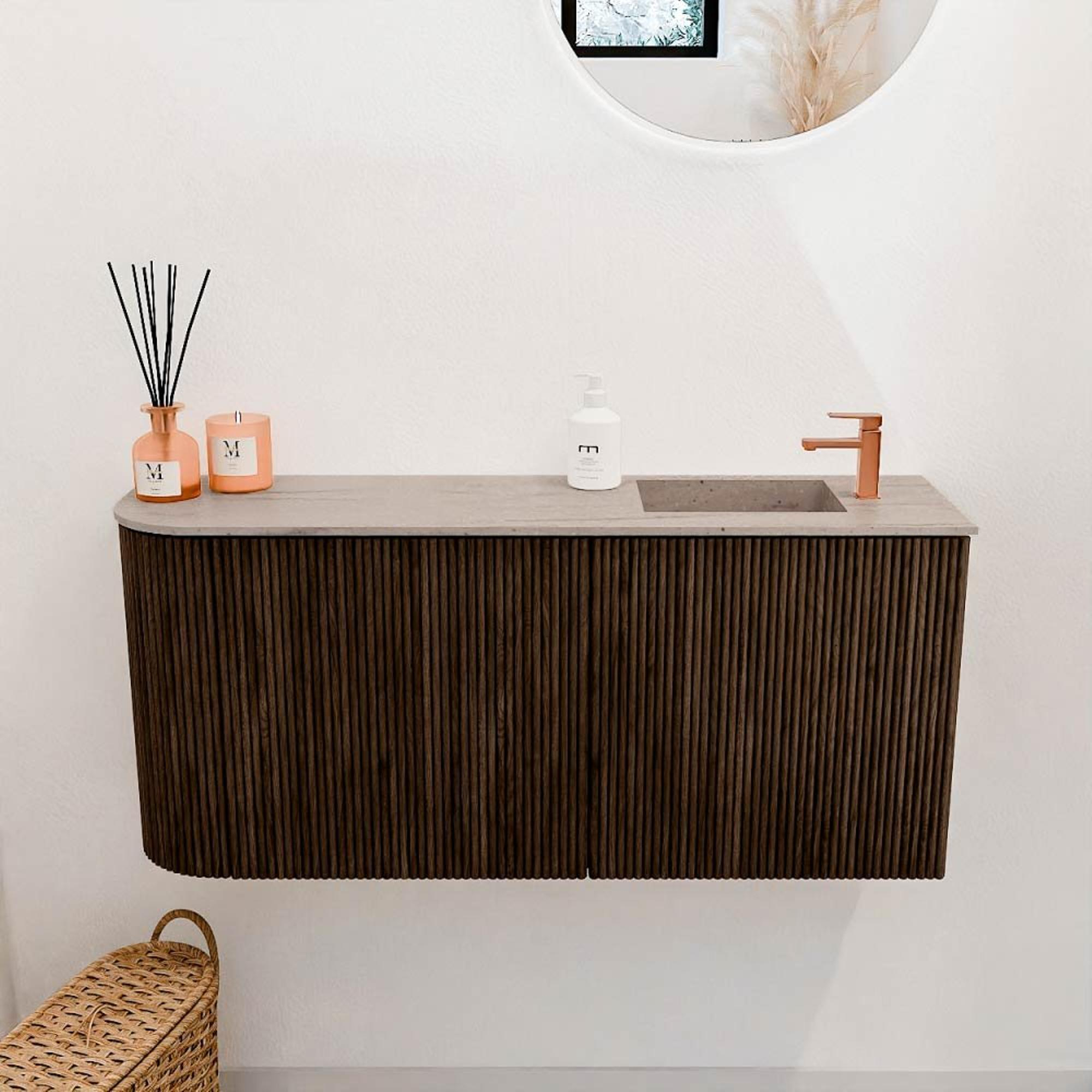 Het meubel valt direct op door zijn warme walnootkleur en de verfijnde verticale ribstructuur op de voor- en zijkanten. Deze details geven het een exclusieve uitstraling die moeiteloos past bij diverse interieurstijlen, van modern tot klassiek. De subtiele ronding aan de linkerkant maakt het ontwerp uniek en zorgt voor een speels effect zonder afbreuk te doen aan de strakke lijnen. Zo creëer je een badkamer die niet alleen functioneel is, maar ook een echte blikvanger wordt. De combinatie van natuurlijke houttinten en het design zorgt ervoor dat je badkamer een uitnodigende sfeer krijgt waar je graag tijd doorbrengt.