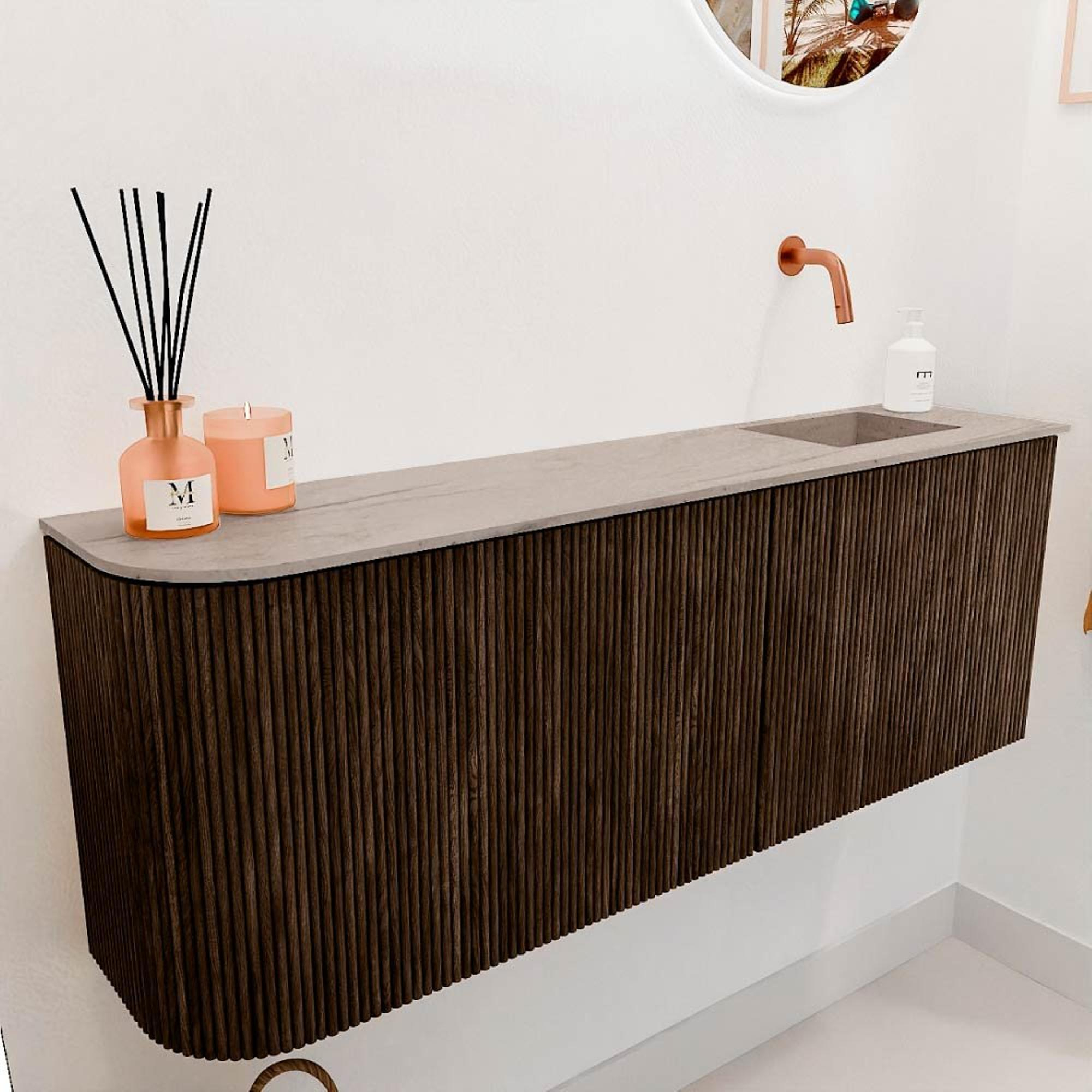Dit meubel valt direct op door zijn elegante walnootafwerking en de subtiele verticale ribbels die het front een bijzonder karakter geven. De links afgeronde vorm maakt het ontwerp niet alleen uniek, maar zorgt ook voor een zachte, uitnodigende uitstraling. Door de combinatie van massief eikenhout en eikenfineer straalt het meubel kwaliteit en vakmanschap uit. Zo voeg je een stijlvol element toe aan jouw badkamer dat zowel modern als tijdloos is. De warme houttinten brengen een natuurlijke sfeer die rust en comfort creëert – precies wat je zoekt in een badkamermeubel.