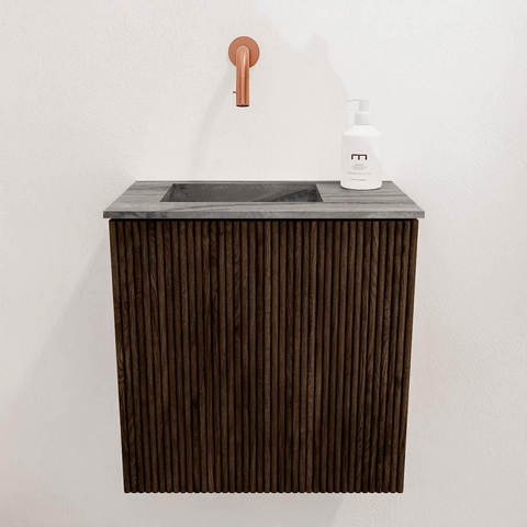 De warme walnootkleur en het natuurlijke houtaccent maken dit meubel tot een stijlvolle toevoeging aan elke badkamer of toiletruimte. De verticale ribbels geven het meubel een eigentijdse uitstraling die zowel klassiek als modern oogt. Dit zorgt ervoor dat het meubel moeiteloos aansluit bij diverse interieurstijlen, van landelijk tot industrieel. Door de subtiele kleur van de wastafel in Sombra ontstaat een mooi contrast dat de ruimte visueel verrijkt. Zo geniet je niet alleen van een functioneel meubel, maar ook van een echte eyecatcher die jouw badkamer een luxe uitstraling geeft.