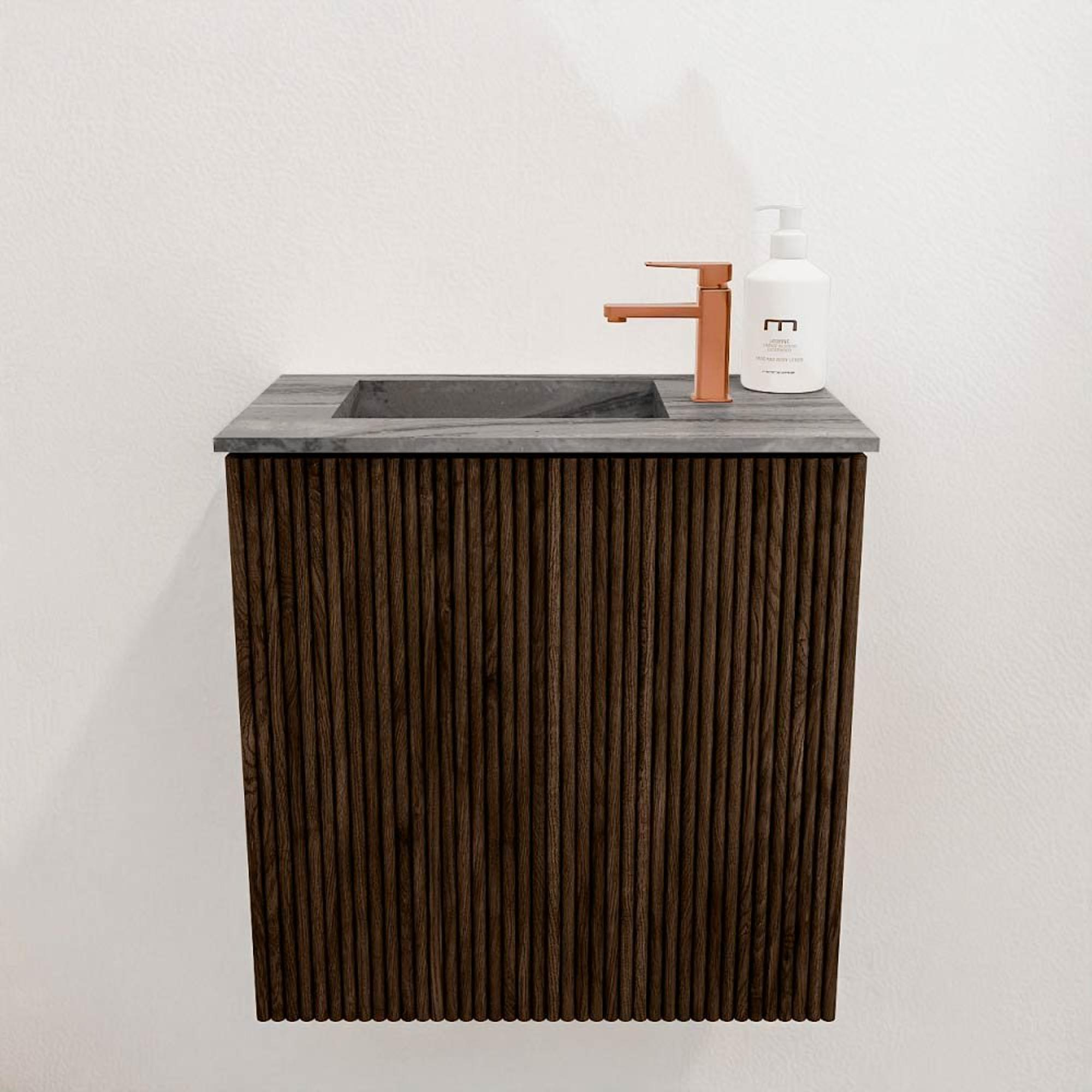 - Wastafel Faye in kleur Sombra met één kraangat links, breedte circa 41 cm