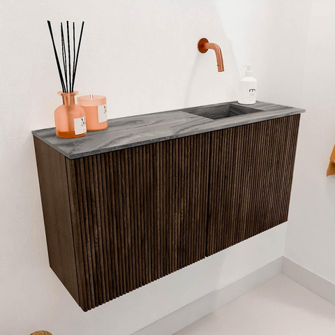 Dit meubel valt direct op door zijn elegante uitstraling. De verticale ribbels op de fronten geven het een unieke textuur en een moderne twist, terwijl het warme walnootfineer een natuurlijke sfeer toevoegt. Het gebruik van echt eikenhout aan de voorkant en de zijkanten benadrukt de hoogwaardige kwaliteit en zorgt voor een luxe gevoel. Zo geniet je niet alleen van een praktisch meubel, maar ook van een echte blikvanger die jouw badkamer een exclusieve uitstraling geeft.