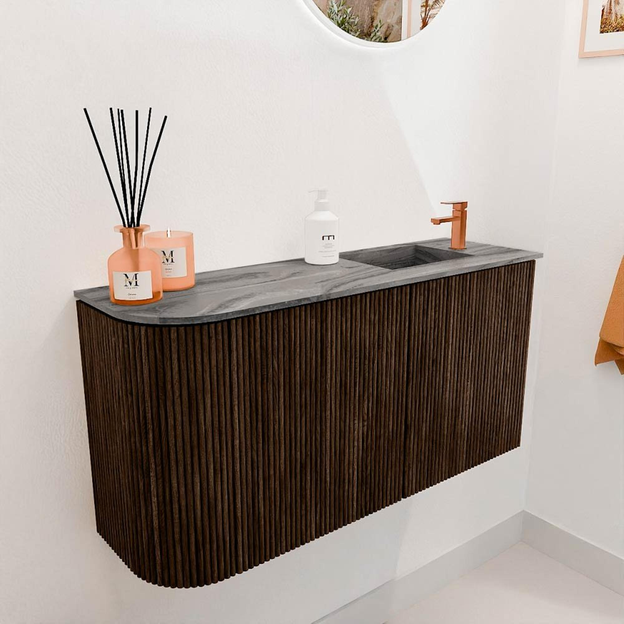 Dit meubel valt direct op door zijn verfijnde uitstraling. De combinatie van massief eikenhout aan de voorkant met eikenfineer aan de zijkanten geeft het een luxe en natuurlijke look die perfect past in moderne én klassieke badkamers. De verticale ribstructuur voegt een subtiel detail toe dat het meubel extra karakter geeft. Dankzij de warme walnootkleur en de zachte ronding aan de linkerkant wordt jouw badkamer een plek waar stijl en comfort samenkomen. Zo creëer je een badkamer die niet alleen functioneel is, maar ook een lust voor het oog.