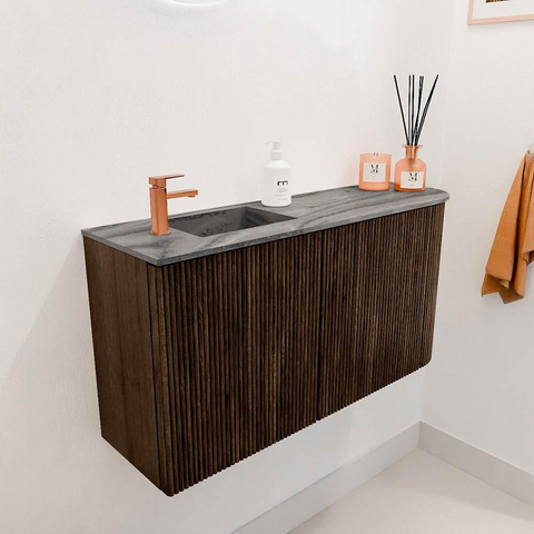De combinatie van massief eikenhout en walnootfineer geeft dit meubel een tijdloze en luxe uitstraling. De warme houttinten zorgen voor een natuurlijke sfeer, die je badkamer direct uitnodigend maakt. De verticale ribbels voegen een eigentijds detail toe, waardoor het meubel zich onderscheidt zonder te overheersen. Zo geniet je van een stijlvol element dat moeiteloos aansluit bij diverse interieurstijlen, van modern tot klassiek.