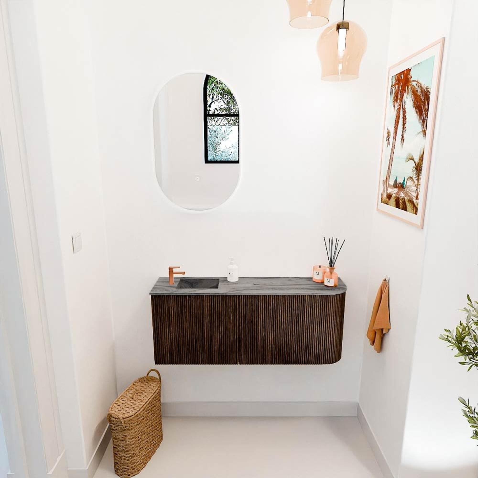 Het meubel valt direct op door de warme walnootkleur en de elegante ronding aan de rechterkant. Deze unieke vormgeving geeft jouw badkamer een moderne en toch tijdloze uitstraling. De verticale ribstructuur op het front voegt een subtiel speels element toe, waardoor het meubel een echte blikvanger wordt. Dankzij het doordachte design combineer je functionaliteit met een luxe uitstraling, wat jouw badkamer een hoogwaardige en verzorgde sfeer geeft.