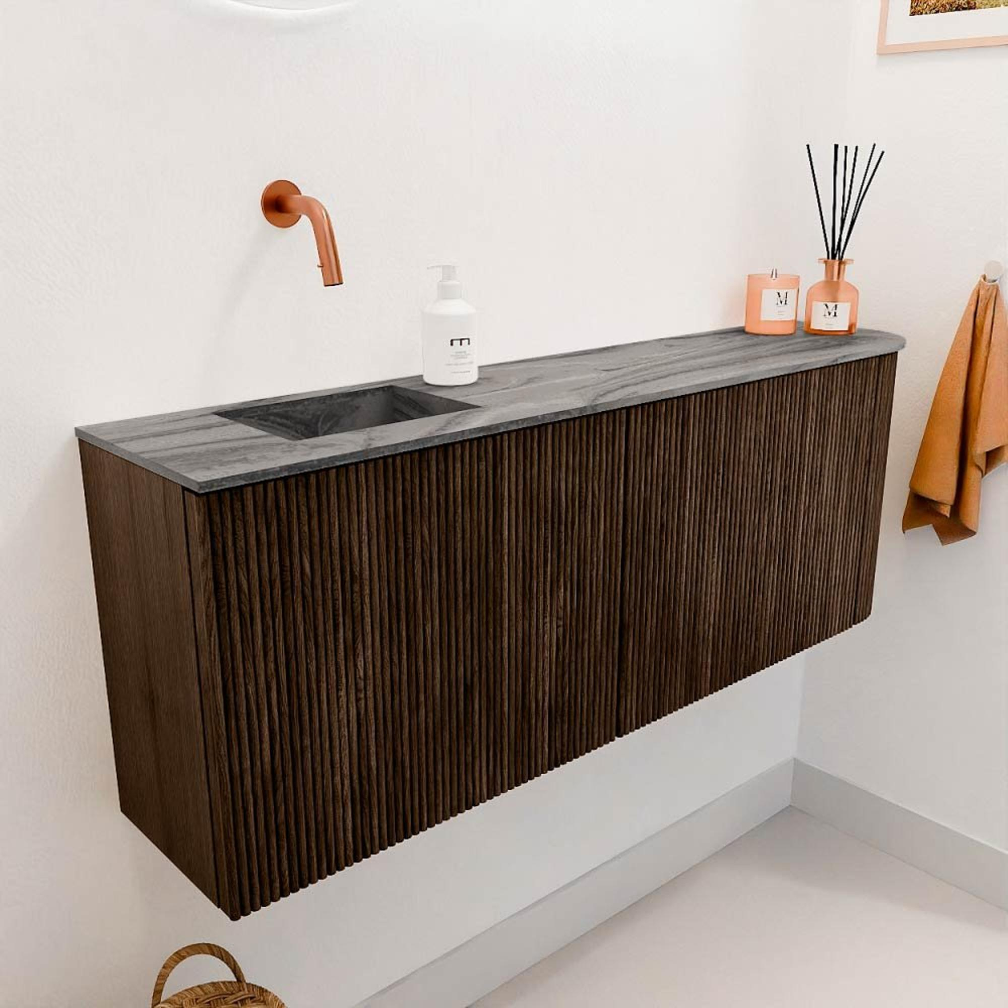 Dit meubel valt direct op door zijn warme walnootkleur en de elegante ronding aan de rechterkant. De natuurlijke houtlook geeft een gevoel van rust en luxe, waardoor jouw badkamer een uitnodigende sfeer krijgt. De combinatie met de donkere wastafel in Sombra zorgt voor een fraai contrast dat modern en tijdloos tegelijk is. Door het doordachte ontwerp met twee deuren blijft alles netjes uit het zicht, wat bijdraagt aan een opgeruimd en stijlvol geheel. Zo geniet je niet alleen van een mooi meubel, maar ook van een badkamer die rust en klasse uitstraalt.