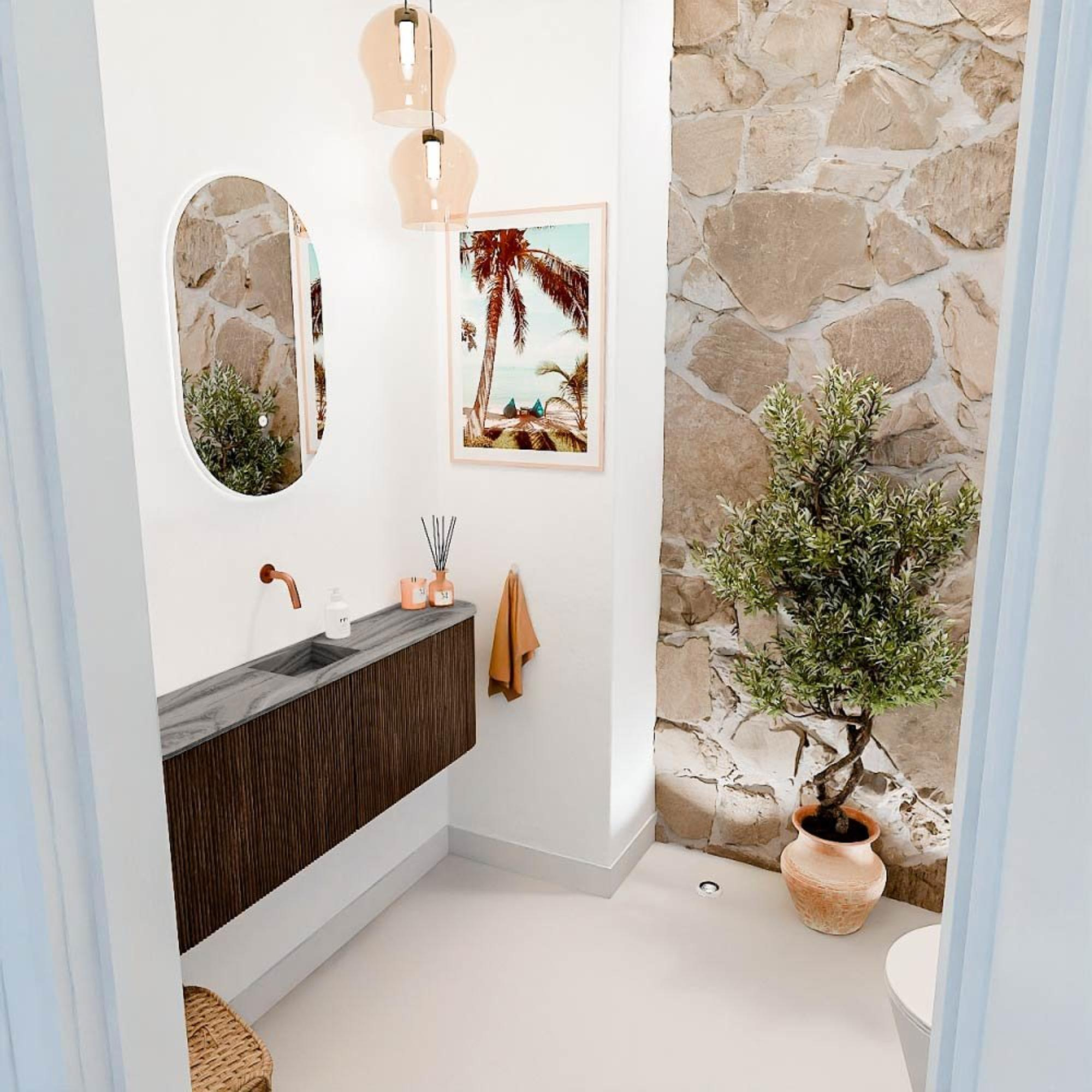 De warme walnootkleur geeft het meubel een natuurlijke en tijdloze uitstraling die moeiteloos past in diverse interieurstijlen. De ronde vormen aan de linker- en rechterzijde zorgen voor een zacht en elegant design, waardoor het meubel een echte blikvanger wordt. Door de combinatie met de Sombra wastafel ontstaat een subtiel contrast dat de ruimte visueel verrijkt. Dit meubel is niet zomaar een functioneel element, maar een stijlvol pronkstuk dat jouw badkamer een persoonlijke touch geeft. Zo creëer je een omgeving waarin je je echt thuis voelt.