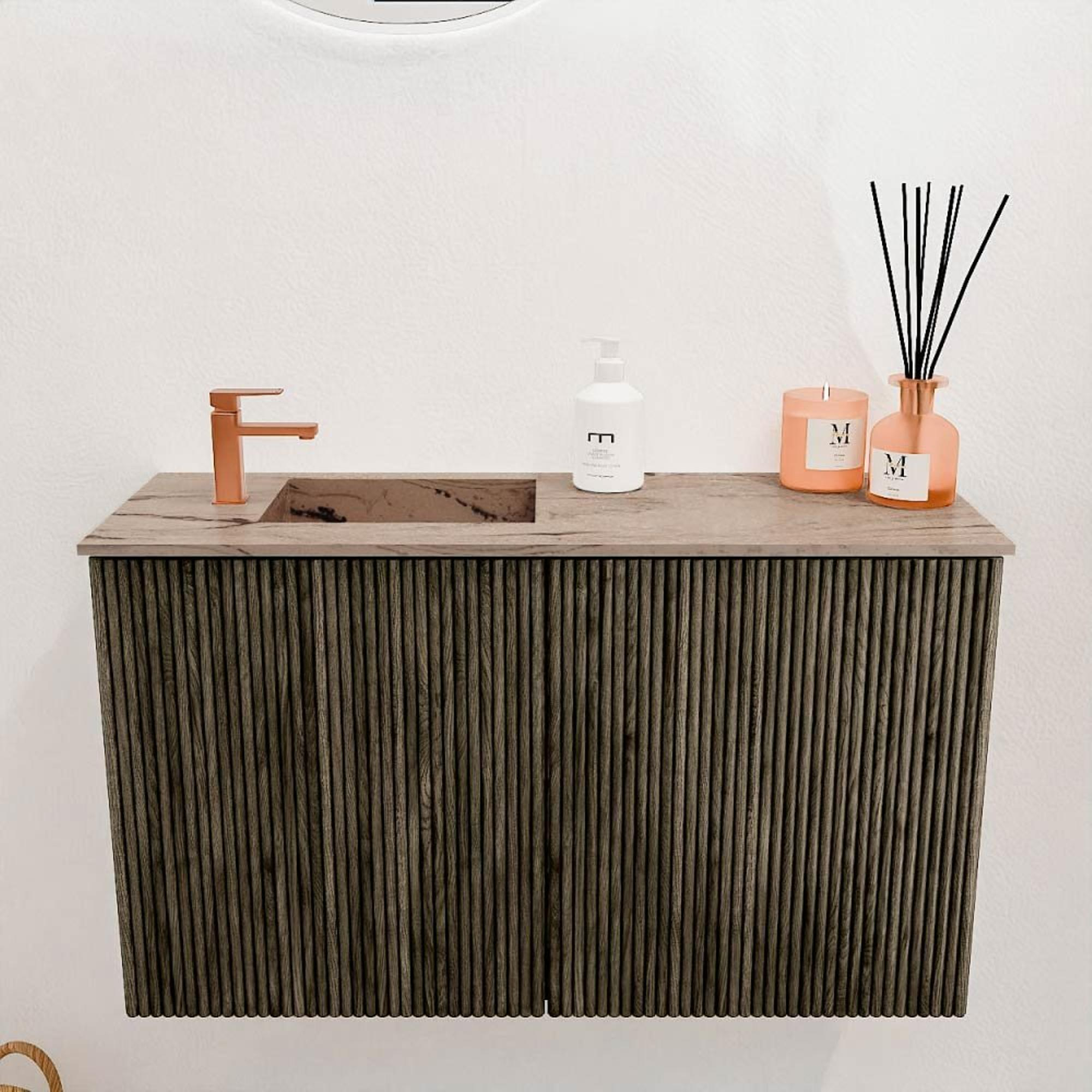 Het meubel valt direct op door de elegante verticale groeven en de warme kleur Shadow, die samen een verfijnde en natuurlijke uitstraling geven. De fronten zijn gemaakt van massief eikenhout, wat niet alleen luxe uitstraalt maar ook zorgt voor een unieke textuur en karakter. De combinatie met eikenfineer aan de zijkanten maakt het meubel tot een echte blikvanger in jouw badkamer. Door het strakke design en de subtiele details past het meubel moeiteloos in diverse interieurstijlen, van modern tot klassiek. Zo geniet je van een badkamer die niet alleen functioneel is, maar ook een echte sfeermaker.