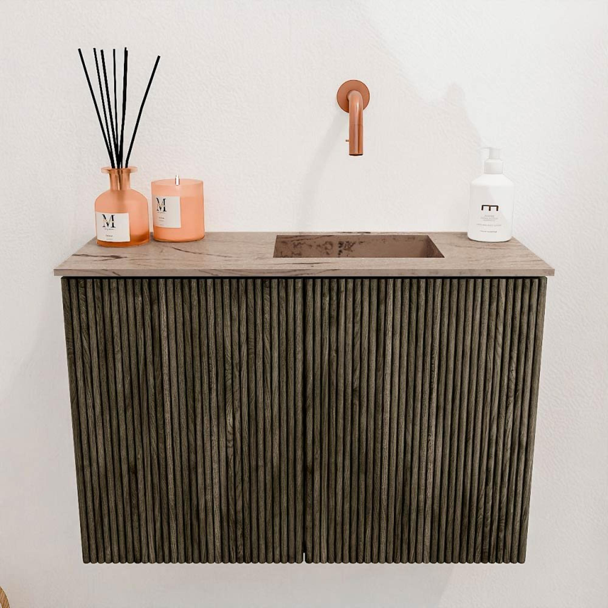Dit meubel valt direct op door zijn elegante ontwerp en hoogwaardige materialen. De combinatie van massief eikenhout met een subtiele verticale ribstructuur geeft het een luxe uitstraling die zowel modern als tijdloos is. De kleur Shadow zorgt voor een rustige, natuurlijke basis die moeiteloos te combineren is met diverse badkamerstijlen. De wastafel in de kleur Arena voegt een warme, zachte tint toe die het geheel in balans brengt. Zo creëer je een badkamer die uitnodigt tot ontspanning en waar je elke dag met plezier gebruik van maakt.