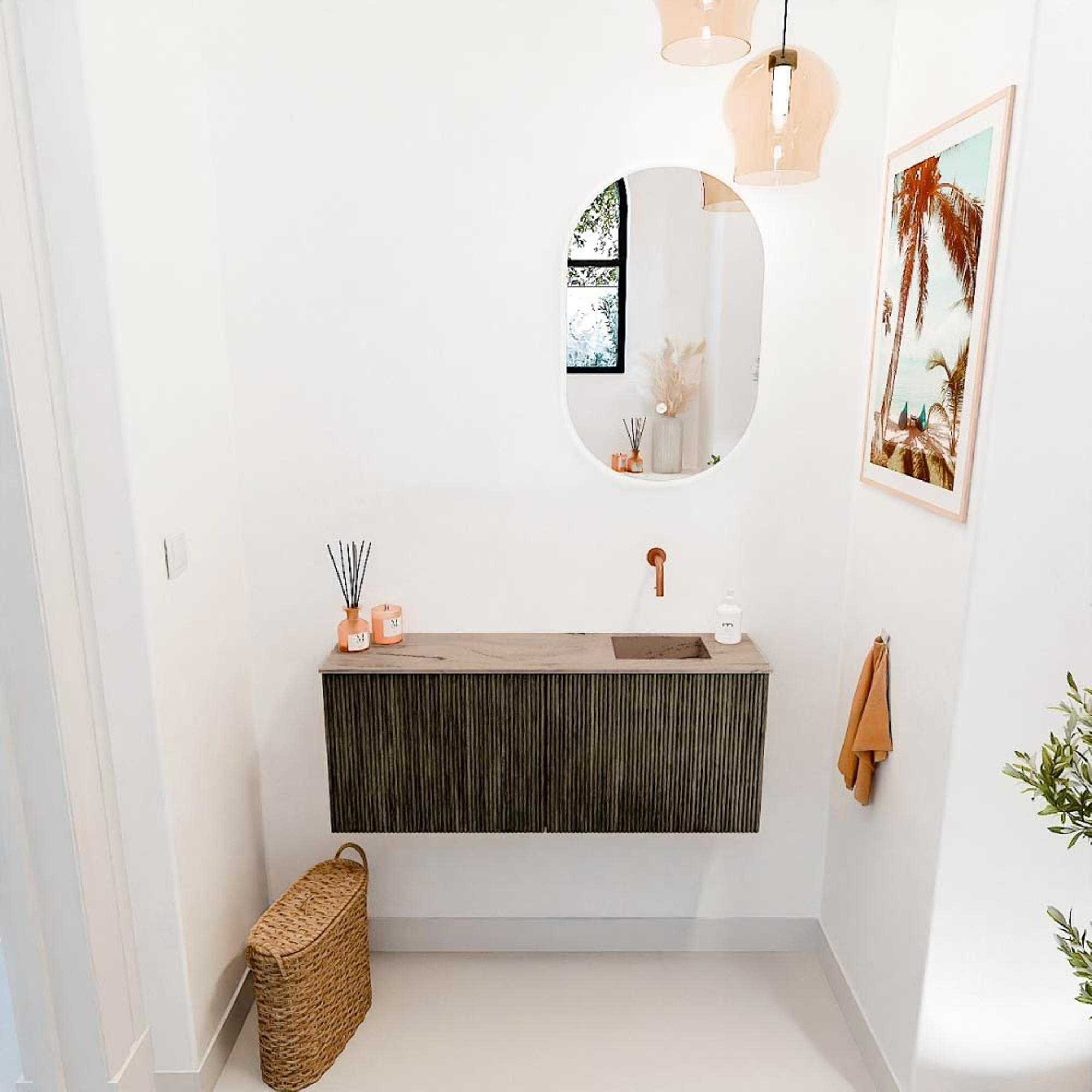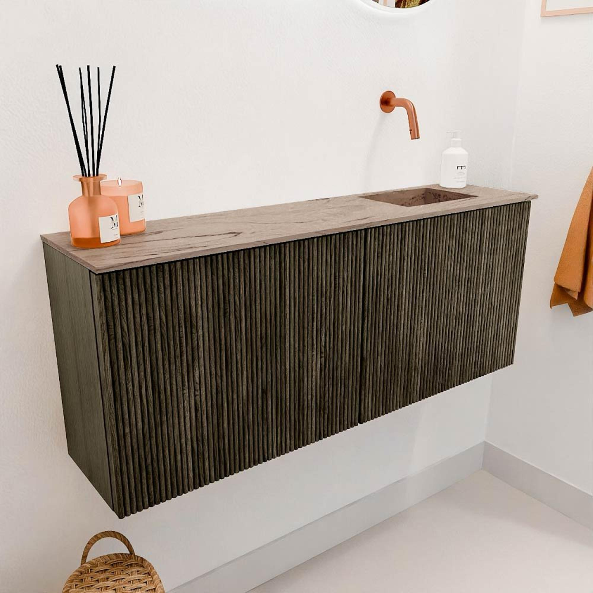Met dit prachtige meubel geef je jouw badkamer direct een stijlvolle en warme uitstraling. De combinatie van de diepe, natuurlijke kleur Shadow met het lichte Arena van de wastafel zorgt voor een subtiel contrast dat rust en elegantie uitstraalt. Dankzij het doordachte ontwerp met verticale ribbels op de fronten krijgt het meubel een eigentijdse en verfijnde look die perfect past in moderne badkamers. Het meubel is niet alleen mooi om te zien, maar ook praktisch: met een breedte van 100 cm biedt het voldoende opbergruimte om jouw badkamer netjes en overzichtelijk te houden. De wastafel is rechts gepositioneerd en zonder kraangat, waardoor je zelf de kraan kunt kiezen die het beste bij jouw stijl en wensen past. Zo creëer je een badkamer die helemaal van jou is, waar je elke dag met plezier begint en eindigt.