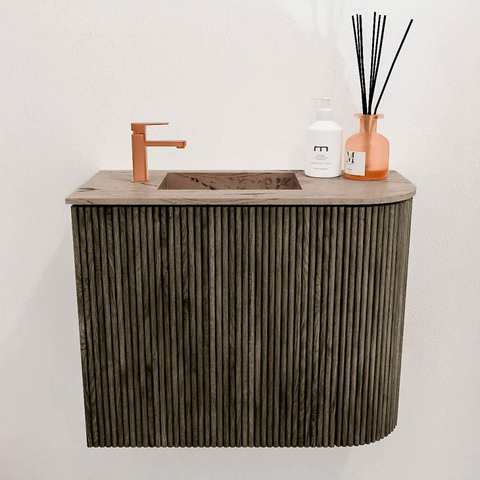 Deze compacte en stijlvolle oplossing brengt direct sfeer en functionaliteit in jouw badkamer of gastentoilet. Met zijn slimme afmetingen van 51,6 cm breed, 24,5 cm diep en 40 cm hoog past dit meubel perfect in kleinere ruimtes waar je toch niet wilt inleveren op kwaliteit en design. Het subtiele samenspel van een warme, shadow-kleurige kast met een elegante wastafel in arena-kleur zorgt voor een natuurlijke en rustgevende uitstraling. Dankzij de ronde vorm aan de rechterzijde en de wastafel die links is gepositioneerd, benut je elke centimeter optimaal. Dit meubel maakt jouw badkamer niet alleen mooier, maar ook praktischer en aangenamer in gebruik. Het is een echte blikvanger die jouw dagelijkse routine een stukje aangenamer maakt en tegelijkertijd een gevoel van luxe toevoegt.