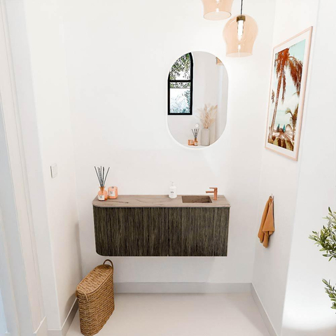Het meubel valt meteen op door zijn tijdloze en verfijnde uitstraling. De linkse ronding en verticale groeven geven het een unieke touch die je niet snel ergens anders vindt. De combinatie van de donkere Shadow kleur met de lichte Arena wastafel zorgt voor een harmonieus contrast dat zowel modern als warm aanvoelt. Dit maakt het meubel perfect voor wie een badkamer wil die zowel uitnodigend als elegant is. Door het subtiele design past het moeiteloos in verschillende interieurstijlen, van strak modern tot klassiek warm.