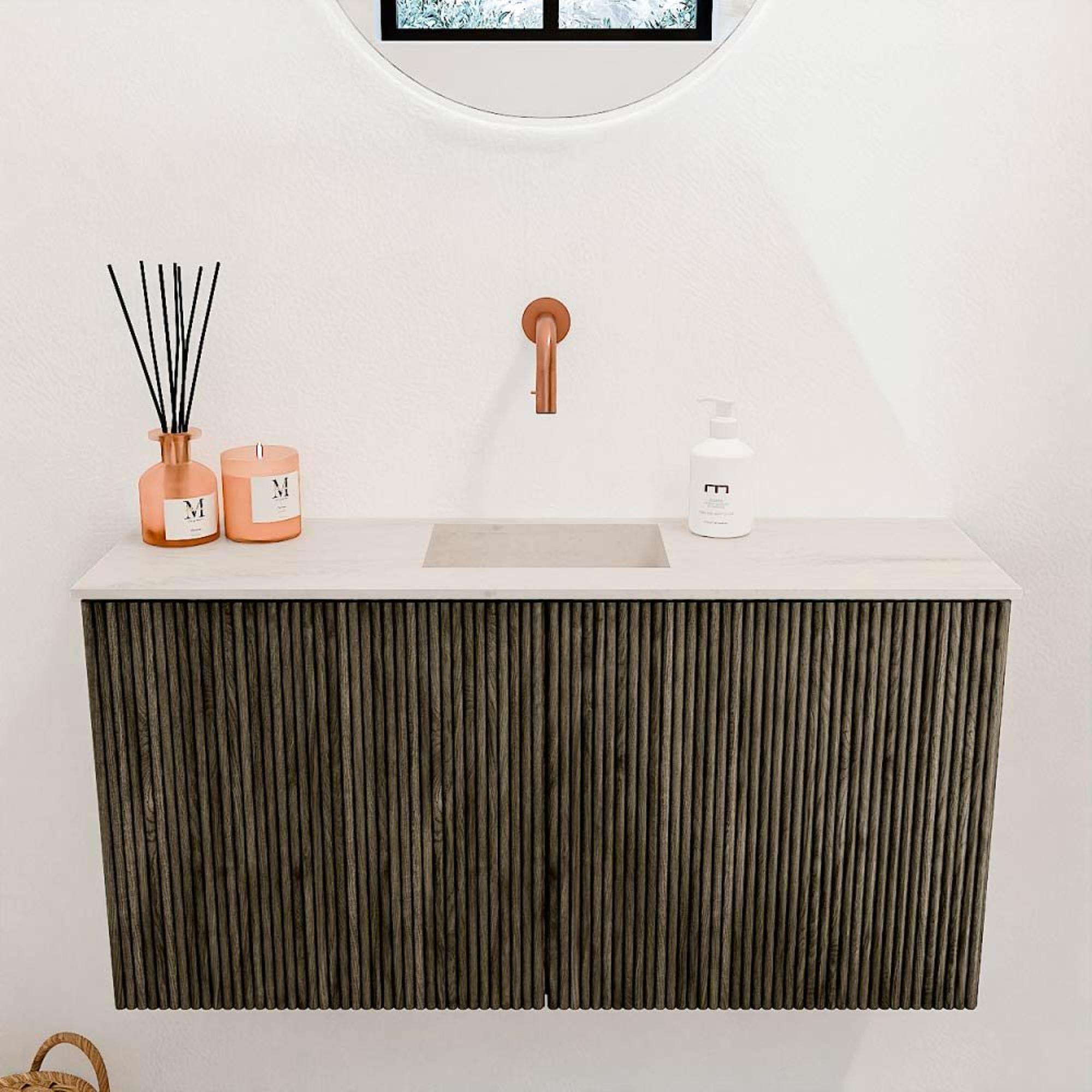 Het meubel valt direct op door zijn elegante uitstraling, mede dankzij de verticale groeven die het front een speels en toch strak karakter geven. De combinatie van massief eikenhout aan de voorkant en eikenfineer aan de zijkanten zorgt voor een warme, natuurlijke look die je badkamer een luxe gevoel geeft. Deze hoogwaardige materialen zijn niet alleen mooi om te zien, maar ook duurzaam en tijdloos. Zo geniet je jarenlang van een badkamermeubel dat nooit uit de mode raakt.