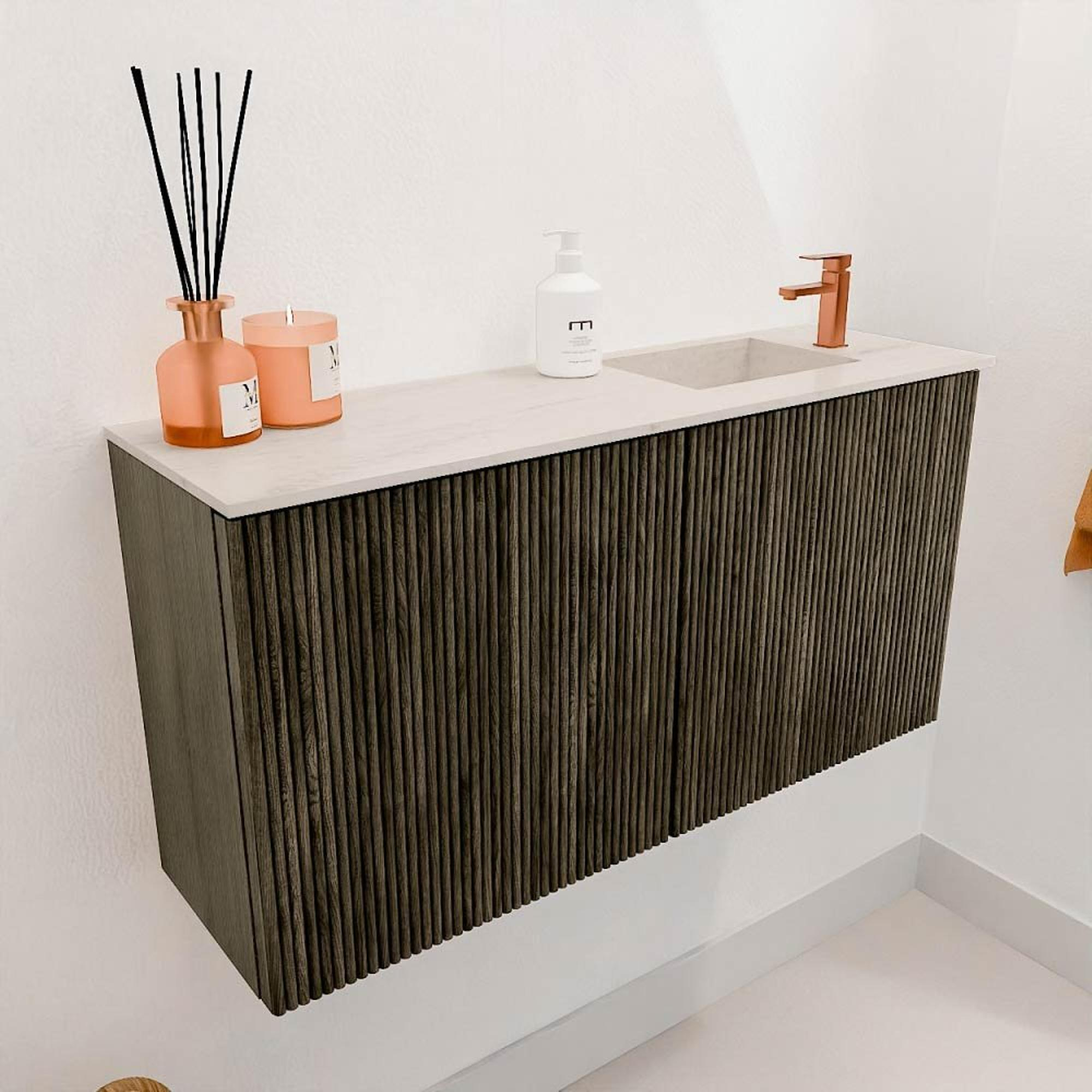 - Wastafel Faye in kleur Meli, positie rechts met één kraangat – praktisch en stijlvol