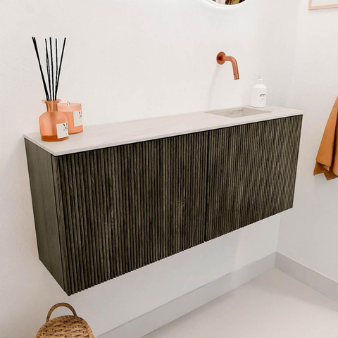 Het meubel valt direct op door zijn tijdloze en verfijnde uitstraling. De combinatie van de diepe Shadow-kleur met de verticale groeven in het ontwerp geeft het een moderne, maar toch warme look. De fronten van massief eikenhout en eikenfineer maken het meubel uniek en zorgen voor een natuurlijke touch die je badkamer meteen een luxe gevoel geeft. Dit meubel past moeiteloos in verschillende interieurstijlen, van strak modern tot landelijk, en tilt de sfeer van je badkamer naar een hoger niveau.
