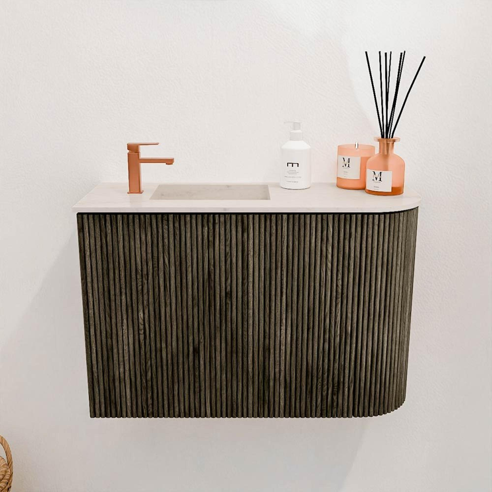 De combinatie van massief eikenhout en eikenfineer geeft dit meubel een exclusieve uitstraling die direct opvalt. De verticale groeven in het front zorgen voor een subtiele textuur en een speels lichtspel, wat het meubel een unieke charme geeft. Door de warme kleur Shadow past het meubel moeiteloos in diverse badkamerstijlen, van modern tot klassiek. Zo creëer je een harmonieuze sfeer waarin je badkamer een echte eyecatcher wordt. Dit stijlvolle ontwerp zorgt ervoor dat je badkamer niet alleen praktisch is, maar ook een plek waar je met plezier tijd doorbrengt.