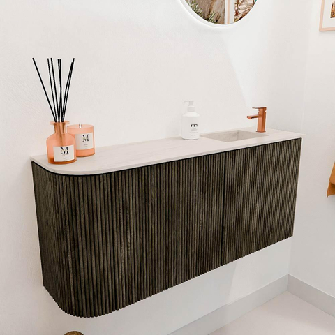 De combinatie van massief eikenhout en eikenfineer in de warme kleur Shadow geeft dit meubel een luxe en natuurlijke uitstraling. Het subtiele ronding aan de linkerkant maakt het ontwerp uniek en zorgt voor een zachte, uitnodigende sfeer. Dit meubel past perfect in zowel moderne als klassieke badkamers, waardoor je altijd verzekerd bent van een tijdloos en elegant element. Door de hoogwaardige afwerking behoudt het meubel zijn charme en uitstraling, zelfs na jarenlang gebruik.