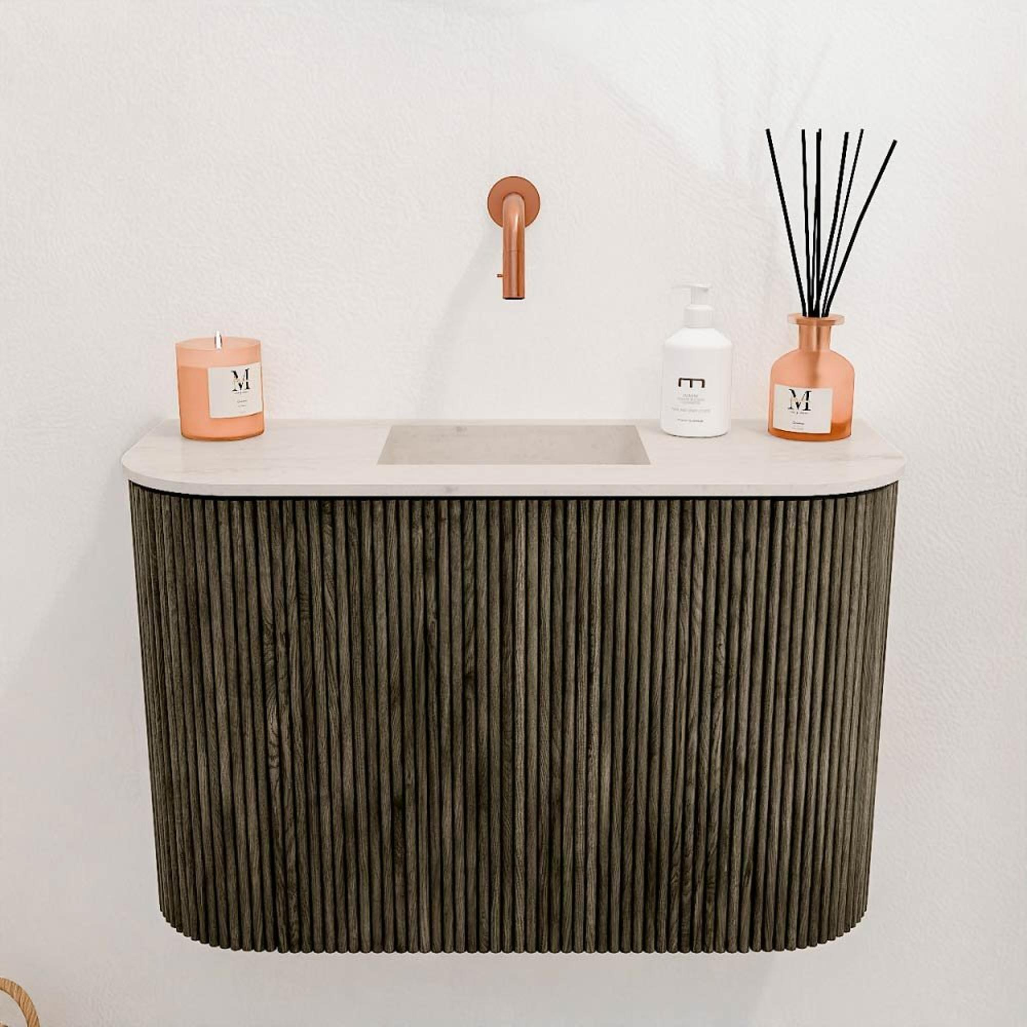 Met dit prachtige meubel geef je jouw toilet een stijlvolle en functionele upgrade. Het combineert een verfijnde uitstraling met slimme details die jouw badkamer direct een luxueuze sfeer geven. Dankzij de subtiele rondingen aan beide zijden en de elegante verticale ribbelstructuur krijgt het meubel een tijdloos karakter dat moeiteloos past in diverse interieurstijlen. De warme, donkere kleur Shadow zorgt voor een rustige en moderne uitstraling, terwijl de wastafel in de zachte Meli-kleur een fraai contrast biedt. Dit meubel is niet alleen een lust voor het oog, maar ook uiterst praktisch: de centrale positie van de wastafel zonder kraangat geeft je alle vrijheid om de kraan naar wens te kiezen en te plaatsen. Zo geniet je van een perfecte balans tussen design en gebruiksgemak, waardoor jouw toiletruimte een plek wordt waar je elke dag met plezier bent.