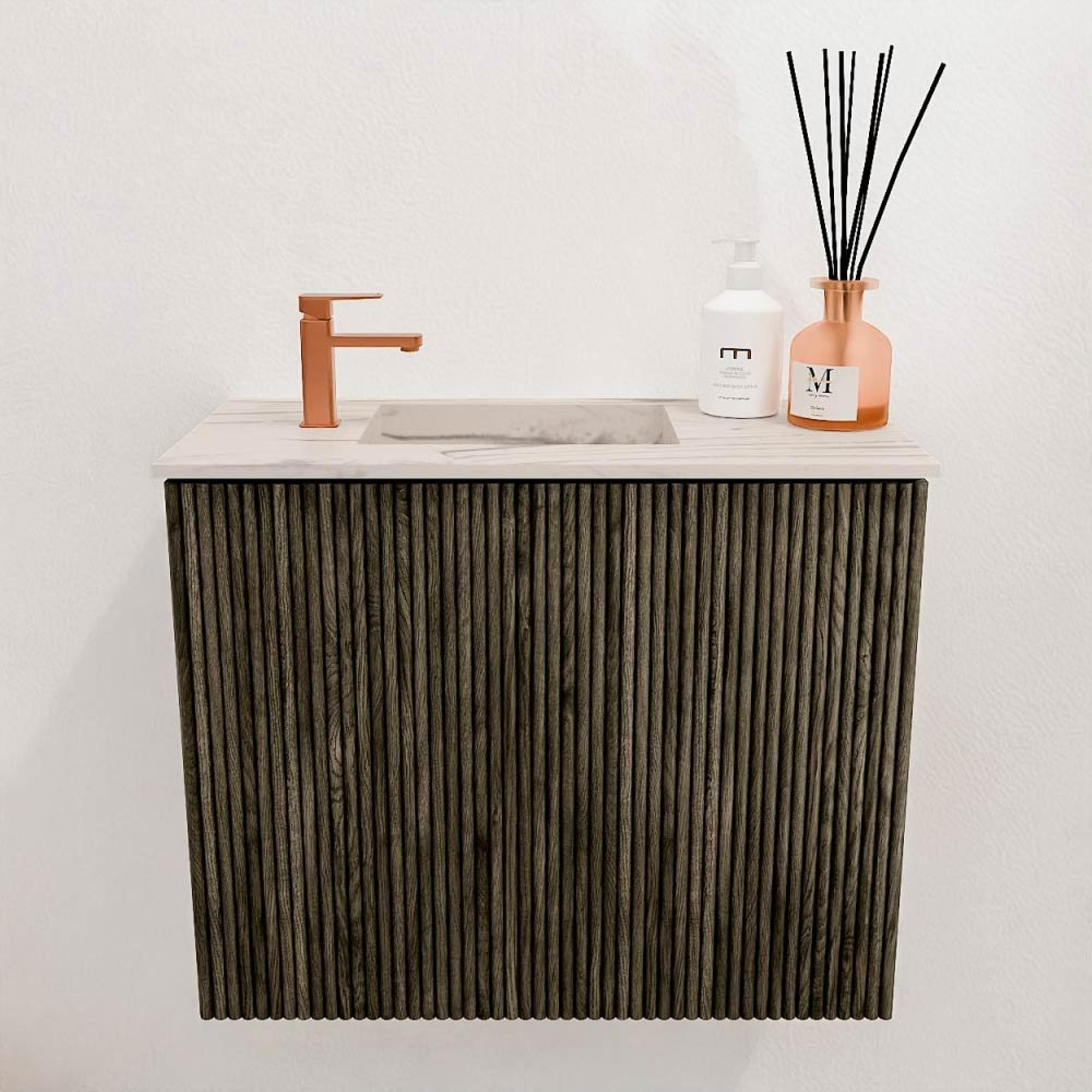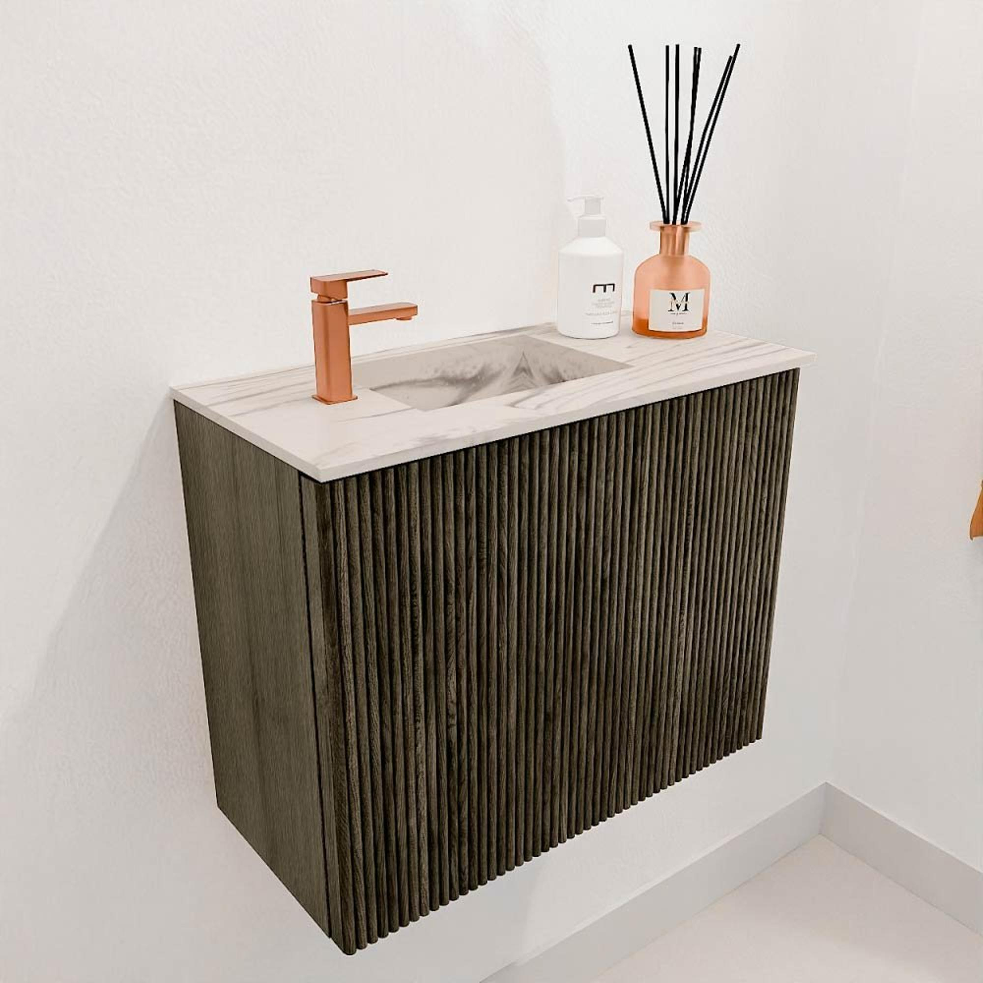 De combinatie van massief eikenhout aan de voorkant en eikenfineer aan de zijkanten geeft dit meubel een luxe en natuurlijke uitstraling. De kleur Shadow voegt een moderne, grijze tint toe die moeiteloos aansluit bij diverse badkamerstijlen. Hierdoor past het meubel zowel in een strak, eigentijds interieur als in een warme, landelijke badkamer. Met dit meubel haal je een tijdloos design in huis dat jarenlang meegaat en jouw badkamer een verfijnde sfeer geeft.