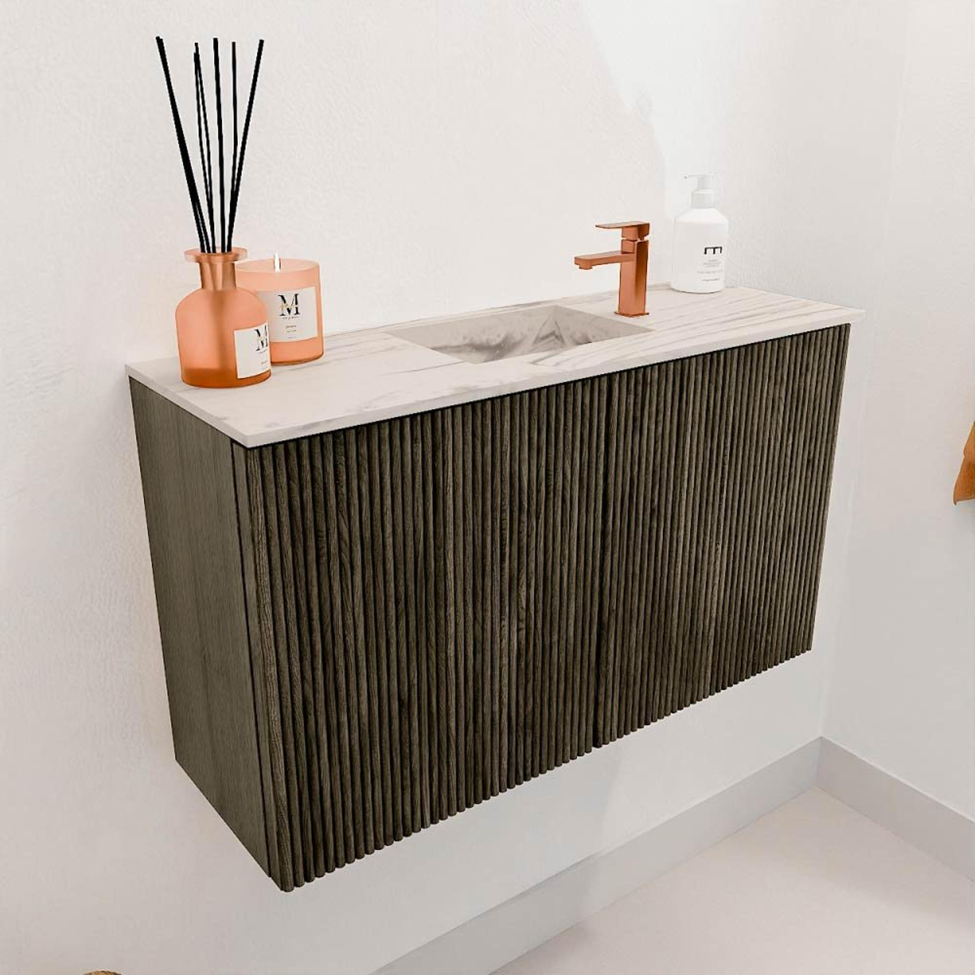 Met zijn elegante verticale groeven en de combinatie van massief eiken fronten met eiken fineer zijkanten, straalt dit meubel pure klasse uit. De kleur Shadow geeft een subtiele, donkere tint die moeiteloos past bij diverse badkamerstijlen. Hierdoor voeg je een warm en natuurlijk element toe aan je interieur. Het design is modern en toch tijdloos, waardoor het meubel jarenlang een stijlvolle toevoeging blijft. Zo geniet je niet alleen van een mooie badkamer, maar ook van een meubel dat je met trots laat zien aan je gasten.