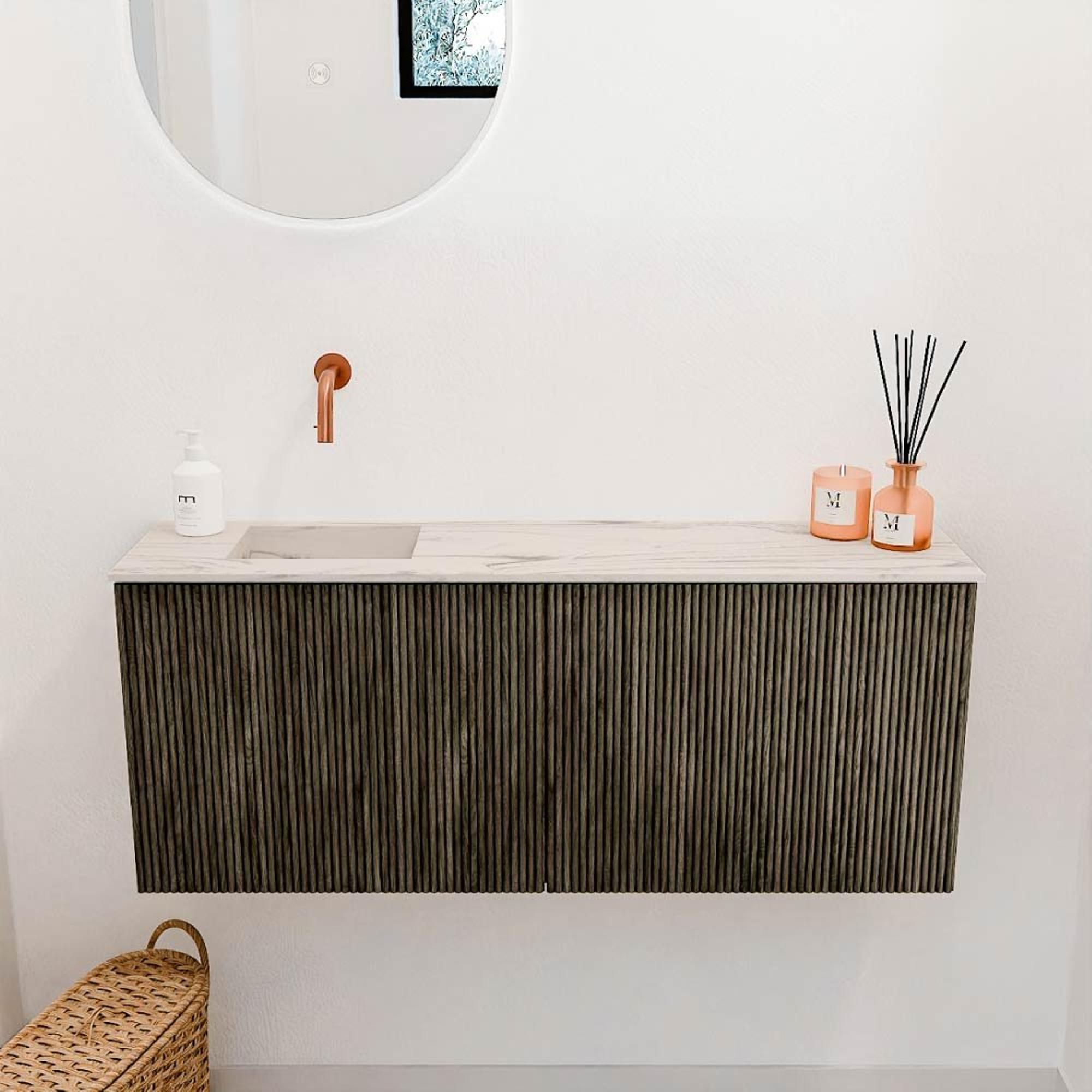 Met dit prachtige meubel geef je jouw badkamer direct een stijlvolle en warme uitstraling. De combinatie van hoogwaardige materialen en een doordacht design zorgt voor een praktische en elegante oplossing die perfect past in moderne badkamers. Dankzij de subtiele, verticale ribbelstructuur op de fronten krijgt het meubel een luxe en tijdloze uitstraling, terwijl de kleur Shadow een rustige en verfijnde sfeer toevoegt. De wastafel, met zijn zachte Nata-kleur en links geplaatste positie, maakt het geheel compleet en biedt volop ruimte om je dagelijkse routine comfortabel en georganiseerd te houden. Dit meubel is niet alleen een blikvanger, maar ook een slimme keuze voor wie kwaliteit en design hoog in het vaandel heeft staan.