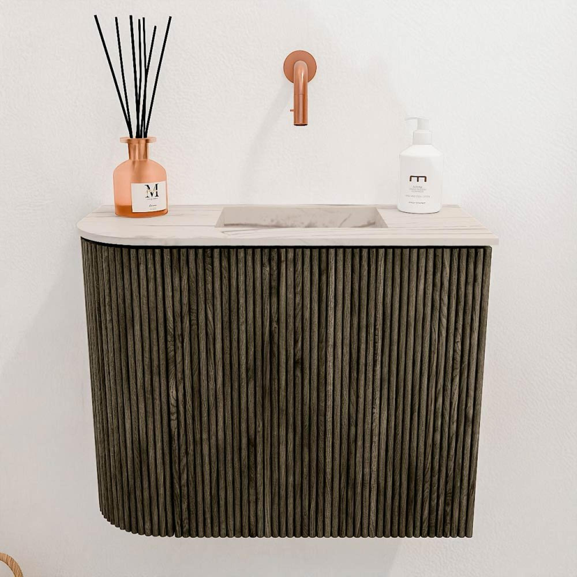 Met dit prachtige meubel geef je jouw badkamer of toiletruimte een stijlvolle en functionele upgrade. Het compacte ontwerp met een breedte van 51,6 cm past perfect in kleinere ruimtes, terwijl de subtiele ronding aan de linkerkant een uniek en elegant detail toevoegt. De combinatie van de diepe Shadow-kleur en het lichte Nata van de wastafel zorgt voor een mooi contrast dat rust en verfijning uitstraalt. Dankzij de slimme opstelling met de wastafel aan de rechterkant benut je elke centimeter optimaal. Dit meubel maakt het mogelijk om je badkamer praktisch in te richten zonder in te leveren op sfeer of kwaliteit. De hoogwaardige materialen en het doordachte design zorgen ervoor dat je jarenlang plezier hebt van dit meubel, dat bovendien eenvoudig aan de wand te bevestigen is. Zo creëer je een frisse, moderne uitstraling die je badkamer direct een upgrade geeft.