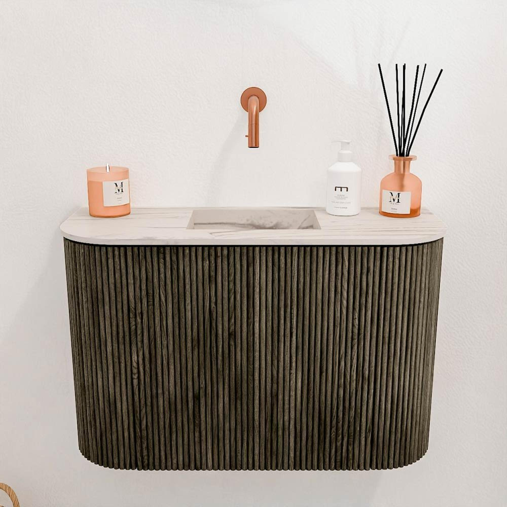 Met dit prachtige meubel geef je jouw badkamer een stijlvolle en warme uitstraling die direct opvalt. Het combineert een strak design met natuurlijke materialen, waardoor het niet alleen mooi oogt, maar ook praktisch in gebruik is. Dankzij de subtiele rondingen aan beide zijden krijgt het meubel een zachte, uitnodigende vorm die perfect past in moderne badkamers waar comfort en design samenkomen. De combinatie van de diepe schaduwkleur van het meubel en de lichte wastafel in Nata-kleur zorgt voor een fraai contrast dat rust en elegantie uitstraalt. Dit meubel is ontworpen om jouw badkamer te transformeren tot een plek waar je elke dag met plezier begint en eindigt, met voldoende opbergruimte en een wastafel die centraal geplaatst is voor optimaal gebruiksgemak.