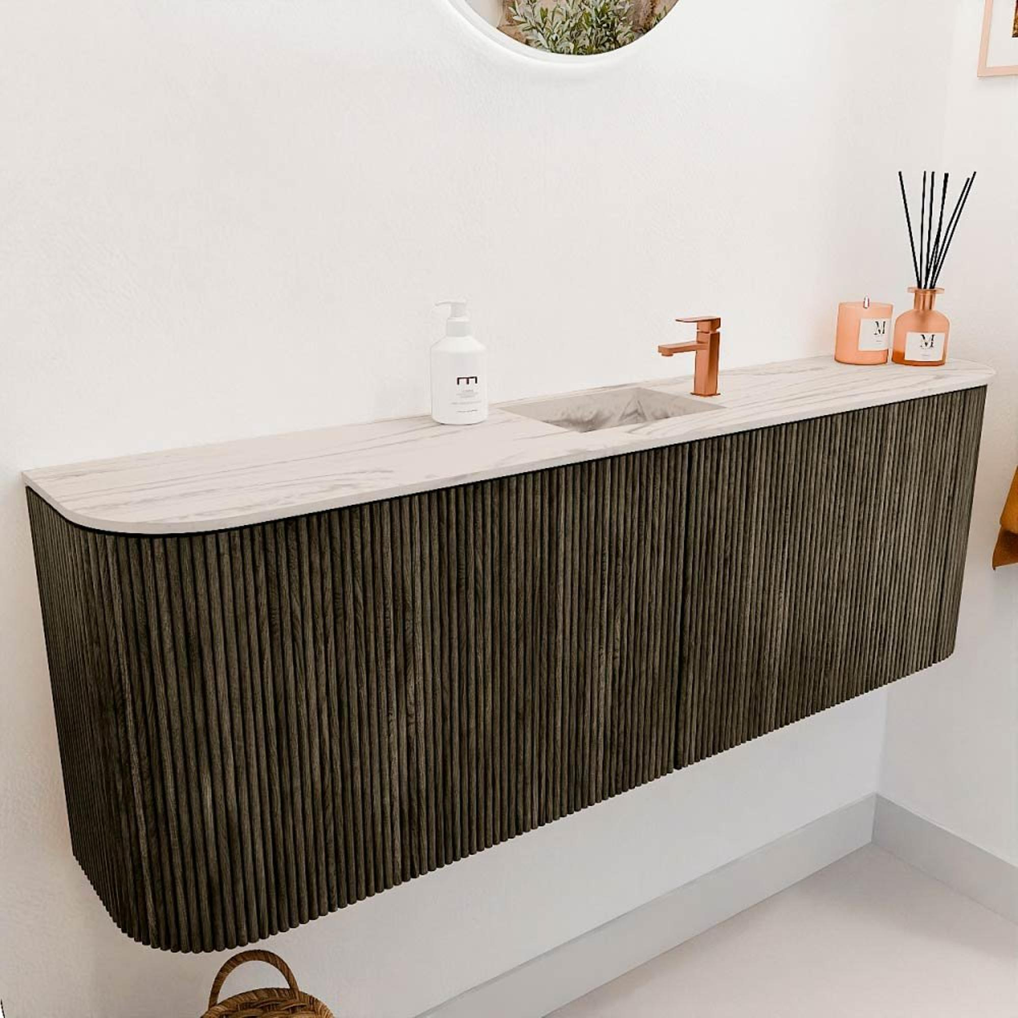 Het meubel valt meteen op door zijn verfijnde design met ronde zijden en een harmonieuze kleurcombinatie. De diepe Shadow-kleur geeft een moderne en luxe uitstraling, terwijl de lichte wastafel in Nata kleur het geheel verfrist. Dit zorgt ervoor dat het meubel moeiteloos in verschillende badkamerstijlen past, van strak en modern tot warm en natuurlijk. Door de aandacht voor detail en het gebruik van hoogwaardige materialen straalt het meubel klasse uit. Zo voeg je niet alleen een functioneel element toe, maar ook een stijlvol pronkstuk dat je badkamer compleet maakt.